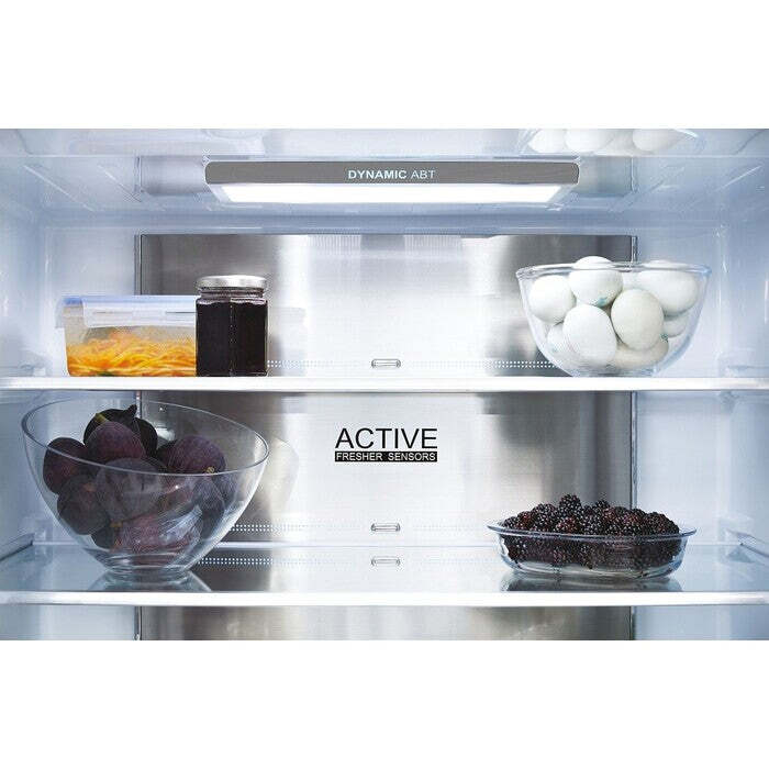 Na každej polici sú umiestnené Fresher senzory, aby bol chladný vzduch distribuovaný len do tej časti chladničky, ktorá to v danej chvíli potrebuje. Táto inteligentná inovácia zaisťuje, že novo pridané potraviny sú rýchlo ochladzované na požadovanú teplotu a čerstvé potraviny si zachovajú cenné živiny. Pri potravinách sa pritom predlžuje možná doba skladovania a celý tento proces optimalizuje spotrebu energie. |