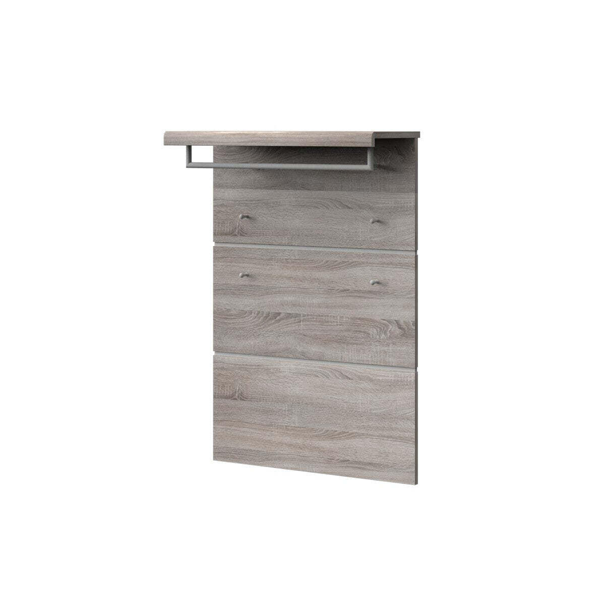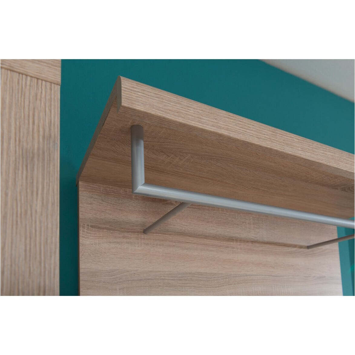 Široký šatníkový panel poslúži ako ďalší priestor, ktorý ponúka odkladaciu policu pre klobúky, šatky, dáždniky a ďalšie veci. Pod touto doskou sa nachádza U-profil, ktorý je určený pre zavesenie šatníkových ramienok. V spodnejšej časti panelu sú po oboch stranách umiestnené nad sebou štyri malé šatníkové háčiky.