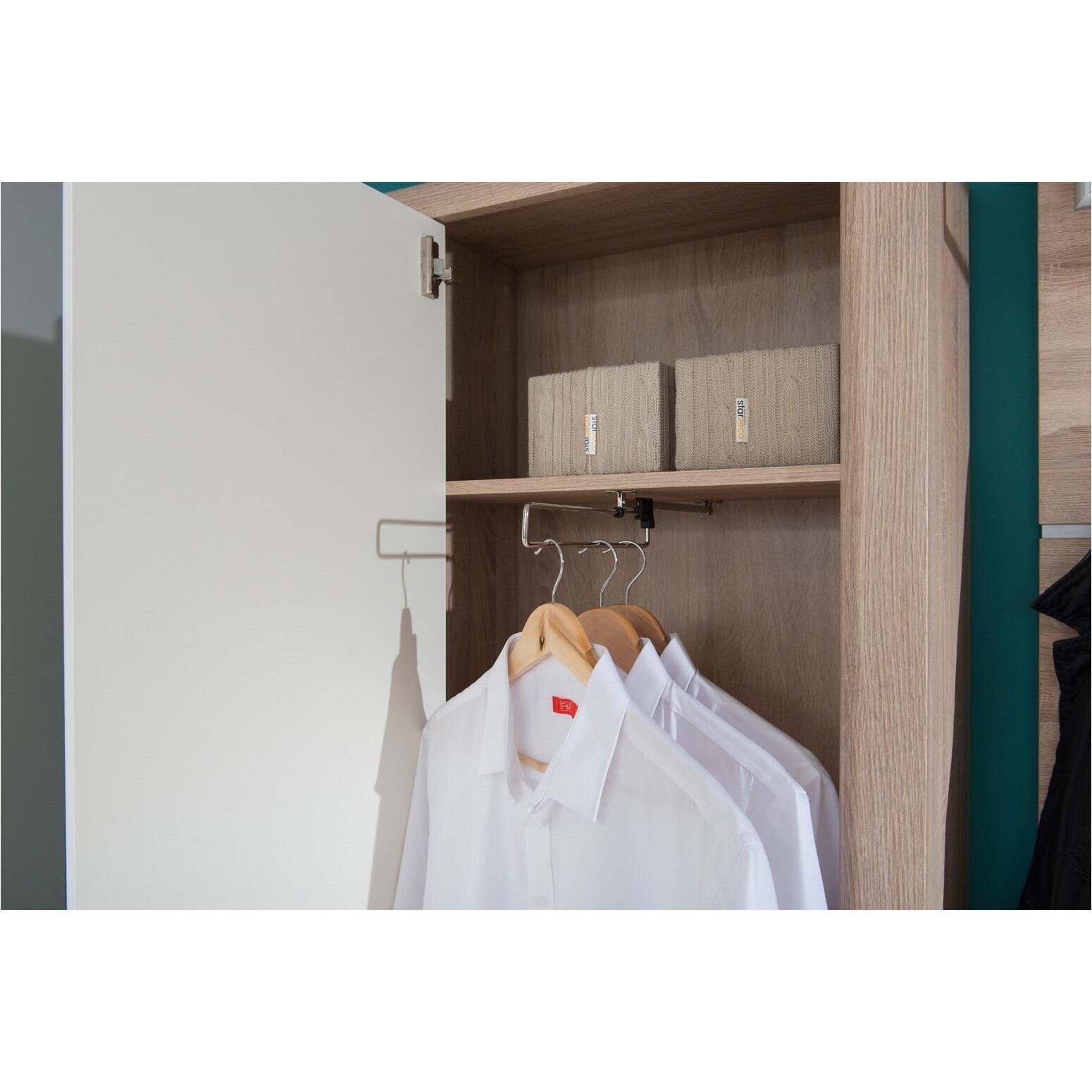 Obdĺžnikový šatník má vo vnútorných priestoroch výsuvný prvok, ktorý je určený na zavesenie šatníkových ramienok. Výsuvná tyč je kvalitne spracovaná a manipulácia s ňou je veľmi jednoduchá a pohodlná. Ďalej má zabudované tlmiče dverí, ktoré zabránia buchnutiu dvierok a nepríjemným zvukom vďaka tlmenému dovretiu. Šetrné zatváranie predĺži aj životnosť celej skrine. Ďalej je vybavená kvalitným kovaním, ktoré v spojení so všetkými ďalšími prvkami tvoria veľmi pôsobivú kombináciu.