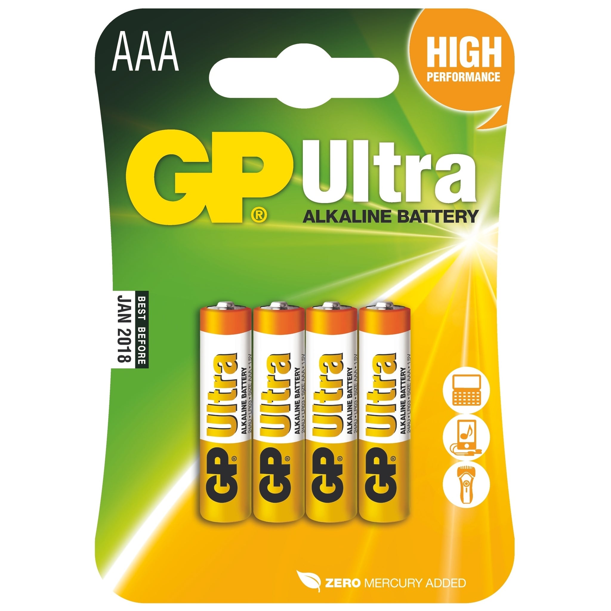 Súprava 4 kusov alkalických mikrotužkových batérií GP Ultra sú vhodné predovšetkým pre prístroje s veľkým odberom energie. Oproti bežným alkalickým batériám dokážu dodať až o 30% viac energie. Disponujú tiež ochranou proti vytečeniu a skladovateľnosťou až 7 rokov.