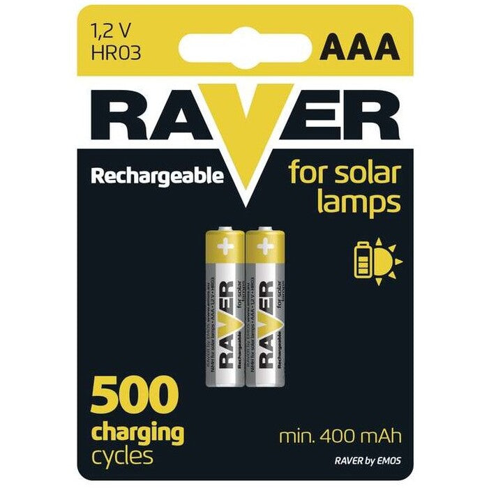 Nabíjacie batérie RAVER HR03 (AAA) sú vyrobené špeciálne na použitie v záhradných solárnych svietidlách. Ich technické parametre úplne zodpovedajú nárokom týchto svietidiel, a to predovšetkým z hľadiska celkovej výdrže. Svojou kapacitou (min. 400 mAh) zaručujú maximálnu dobu svitu svietidla a sú prispôsobené každodennému cyklu nabíjania. Tieto mikrotužkové batérie NiMH poslúžia všetkým, ktorí neradi kupujú neustále nové batérie a chcú sa spoľahnúť na istotu nabíjacích batérií s poriadnou kapacitou. Vymeňte staré batérie za tieto špeciálne a razom dosiahnete obnovenie plnej funkčnosti svietidla! Poteší tiež dlhá životnosť 500 nabíjacích cyklov. V balení nájdete 2 ks 1,2 V batérií.