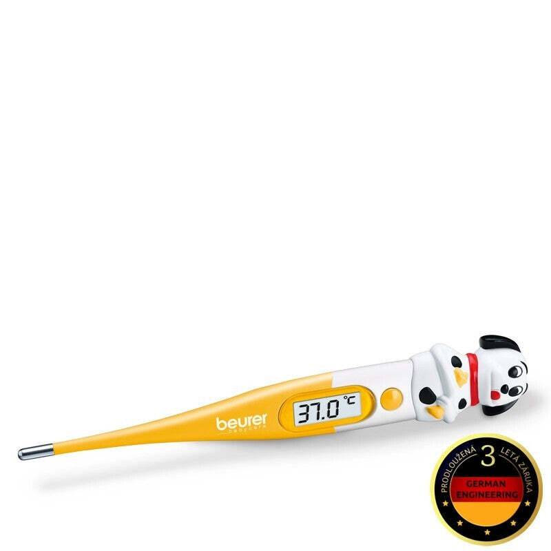 Meranie teploty je pre deti často nepríjemná záležitosť. S ľúbivým detským teplomerom Beurer BY 11 s motívom veselého psíka ju môžete deťom aspoň trochu spríjemniť. Mäkká a ohybná špička uľahčí meranie teploty a urobí ho pre deti pohodlnejším. Teplomer je vodeodolný a dá sa dezinfikovať, nemusíte sa ho teda báť použiť aj na meranie teploty v ústach alebo v konečníku. Teplomer Beurer BY 11 zmeria teplotu do 10 sekúnd s presnosťou +/- 0,1°C a zvukovým signálom vás upozorní na nameranú horúčku. Po 10 minútach sa automaticky vypne.