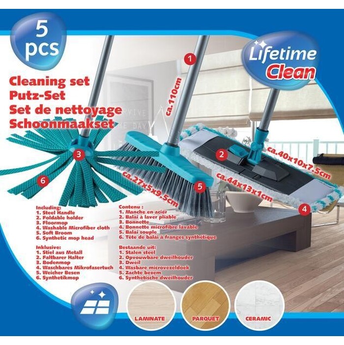 Čistiaca súprava obsahuje1x plochý mop s rozmermi 40 x 10 x 7,5 cm povlak z mikrovlákna s rozmermi 44 x 13 x 1 cm 1x syntetický mop 1x metlička s rozmermi 27 x 5 x 9,5 cm oceľová násada s dĺžkou 110 cm |