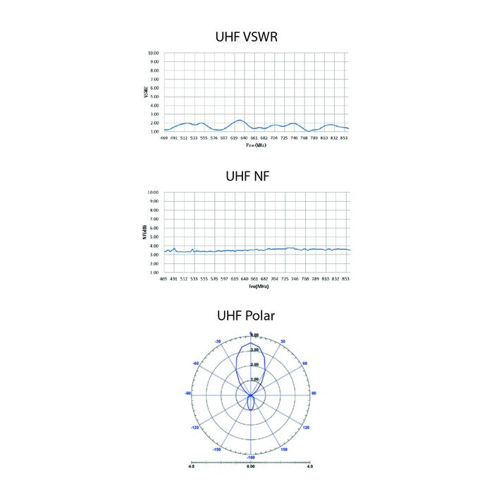 Graf účinnosti, šumu a priestorového ziskuUHF VSWR (Voltage Standing Wave Ratio) graf vyjadruje účinnosť antény pre pásme UHF. Koeficientom VSWR rovný 1 znamená premenu všetkých elektromagnetických vĺn na elektrický signál. Graf VSWR pre anténu HDO dosahuje veľmi vyrovnanej účinnosti a prakticky pre žiadne frekvenčné pásmo nevykazuje nižšiu účinnosť ako 90%, teda hodnota grafu VSWR nie je až na výnimky vyššej ako 2. Graf UHF NF zobrazuje veľkosť šumu antény. HDO vykazuje aj pri veľkom zosilneniu signálu nízkej hodnoty šumu. Graf UHF Polar zobrazuje oblasti priestoru s najväčším ziskom antény. |