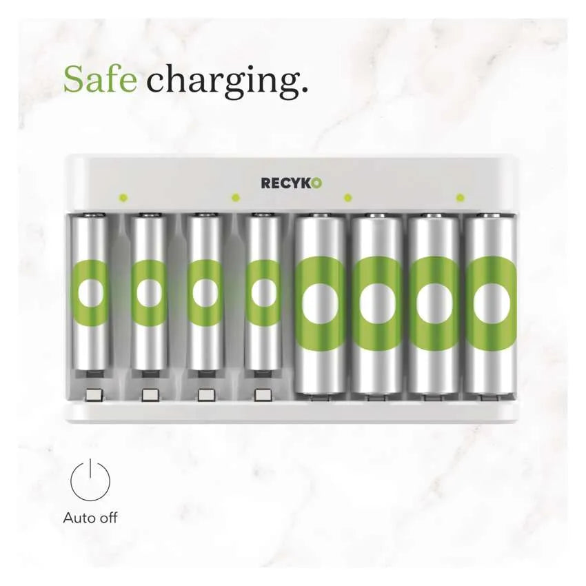 BezpečnosťJe určená pre typ batérií AA alebo AAA. V prípade, že by ste do nabíjačky vložili chybné alebo klasické jednorazové, nabíjačka vás na to upozorní. Rovnako tak vás bude informovať o aktuálnom stave nabíjania. V jednej chvíli môžete mať do prístroja vložených až osem článkov. |