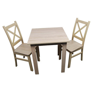 Praktický jedálenský set Timmy IIJedálenský set Timmy II tým pravým miestom na posedenie pri káve alebo ranné raňajky. Jedálenský stôl s doskou s rozmermi 70x70 cm poskytuje dostatok miesta pre 2 osoby a súčasne sa vďaka svojim menším rozmerom skvele hodí aj do menších bytov, kde nezaberá príliš priestoru. Súčasťou setu sú 2 jedálenské stoličky v dekore duba. Vysoké operadlo poskytuje vášmu chrbtu pevnú oporu a zaistí tak pohodlné sedenie. Konštrukcia z dreva je navyše zárukou stability, pevnosti a dlhej životnosti stoličiek. Jedálenský stôl je vyrobený z laminovaných drevotrieskových dosiek (LDTD), ktoré sú čiastočne odolné voči poškriabaniu a ľahko sa udržujú. Jedálenský set Timmy II využijete nielen v jedálňach či kuchyniach, ale svoje uplatnenie nájde napr. vo vstupných halách. |