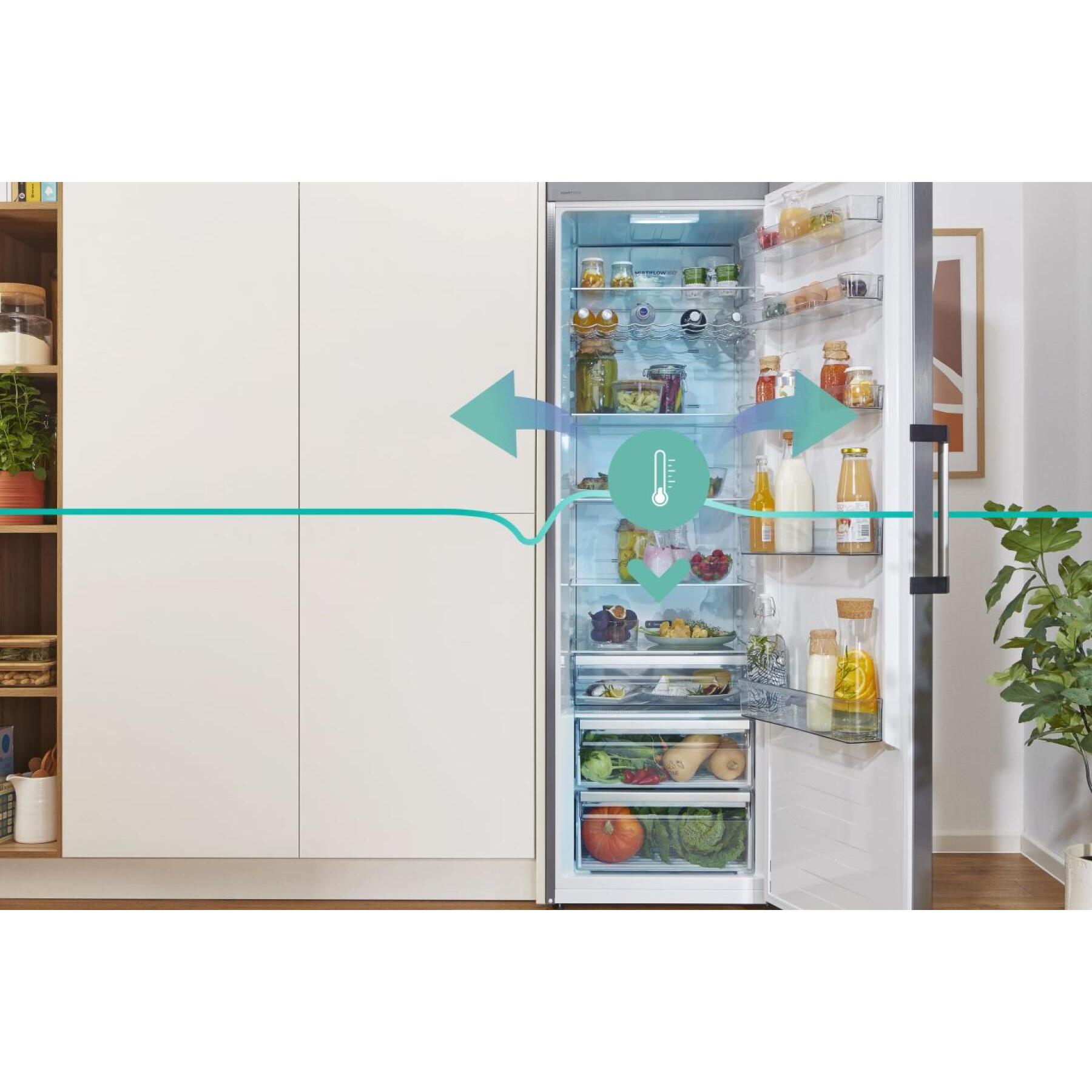 Inteligentný systém AdaptTechInovatívny systém AdaptTech bol vyvinutý s cieľom udržovať stabilnú teplotu v chladničke bez ohľadu na frekvenciu otvárania dverí. Chladnička neustále monitoruje vaše používanie a dynamicky reguluje teplotu, aby zabránila akémukoľvek zvýšeniu teploty, čo zaisťuje udržanie čerstvosti potravín a súčasne znižuje spotrebu energie. |