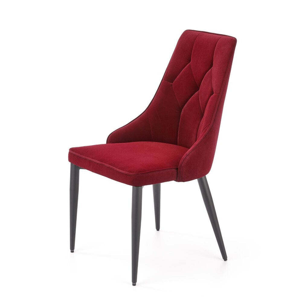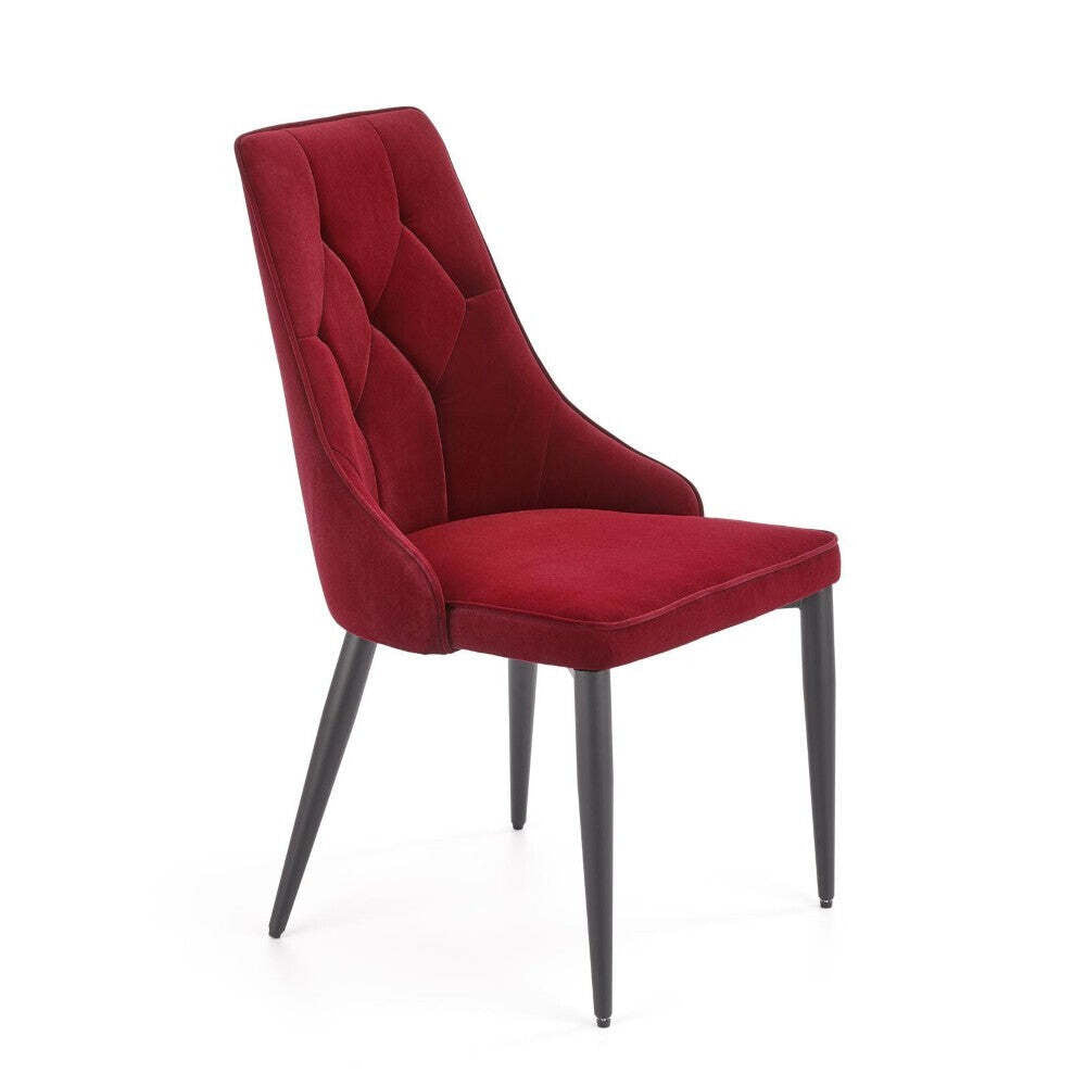 Stylová jídelní židle LiareJídelní židle Liare vás na první pohled zaujme svým stylovým provedením. Je vyrobena z kvalitních materiálů. Stabilitu židli dodávají robustní a odolné kovové nohy v černé barvě. Sedák i opěrák je očalouněn látkou v červené barvě. Vysoký opěrák dá možnost odpočinout vašim zádům a stylové prošití opěráku celou židli skvěle doplní. Díky svému stylovému vzhledu obohatí židle Liare většinu kuchyní a jídelen o prvek originality. |