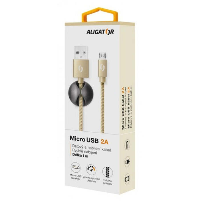 Dátový a nabíjací USB kábel PremiumMicro USB kábel Aligator Premium v zlatej farbe poslúži pre rýchle nabíjanie a prenos dát. USB kábel má dĺžku 1 meter a podporuje výstupný prúd 2 A.