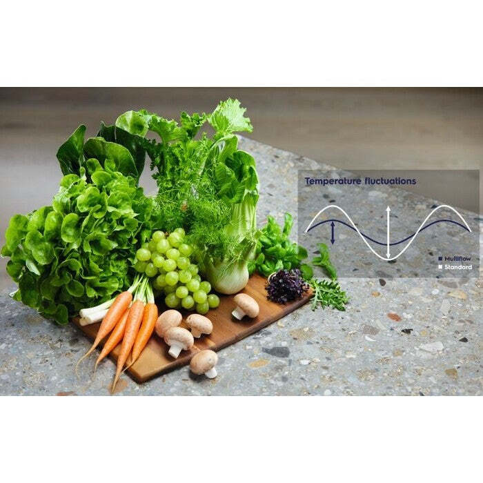 MultiFlowFunkcia MultiFlow sa stará o rovnomernú cirkuláciu vo vnútorných priestoroch chladničky aj mrazničky a distribuuje chladný vzduch aj do posledného kúta. K tomuto slúži systém vzduchových kanálov na zadnej stene. Potraviny zostanú dlhšie čerstvé, zachovajú si svoju chuť a vysokú kvalitu. |