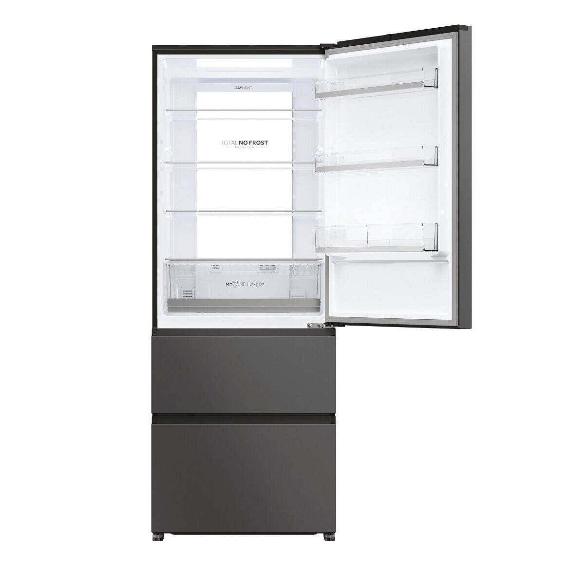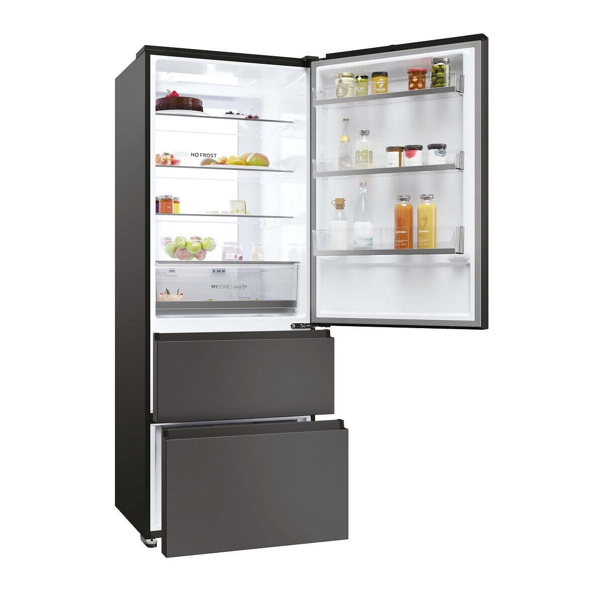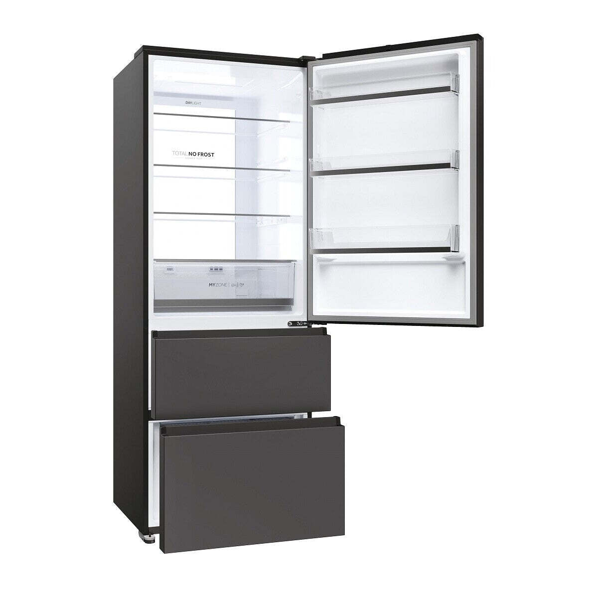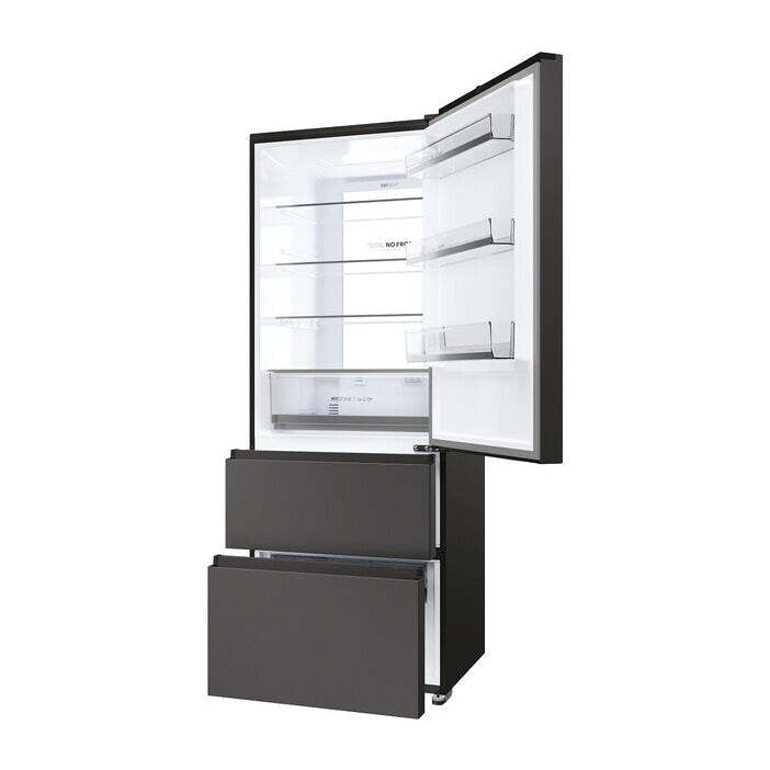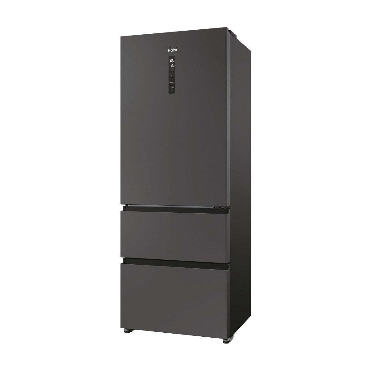 XL priestor pri šírke iba 70 cmElegantná chladnička Haier HTR5719ENPT ponúka pôsobivý chladiaci a mraziaci priestor s celkovým čistým objemom 450 litrov, výškou 190 cm a šírkou 70 cm. Chladiaca časť má objem 310 litrov, tri zásuvky mrazničky celkom 140 litrov.