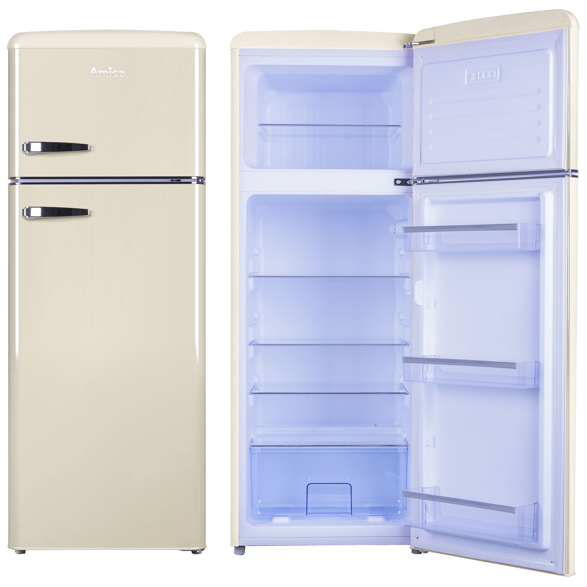 Hľadáte výkonnú kombinovanú chladničku, ale zároveň si prajete, aby vám skvele zapadla do kuchyne? Ak áno, chladnička s mrazničkou od značky Amica je stvorená presne pre vás. Retro chladnička Amica VD 1442 AM s mrazničkou hore v béžovej farbe a praktickými držadlami sa bude hodiť do každej modernej kuchyne. Iste oceníte celkový objem 206 litrov a mechanické ovládanie termostatu. Hoci sa jedná o výkonnú kombinovanú chladničku, jej tichý chod iba 39 dB zabezpečí, že vás nebude nikdy rušiť.