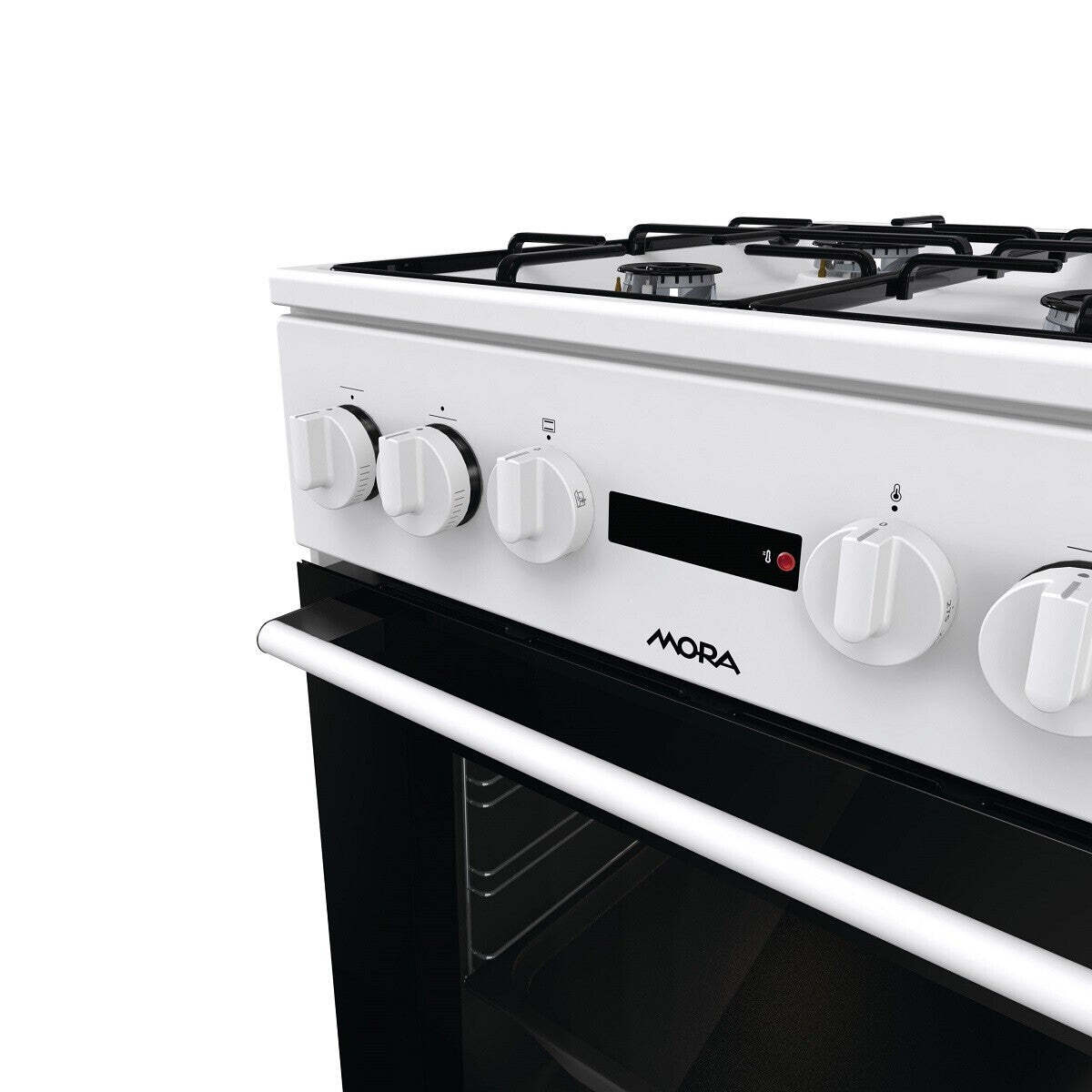 Kombinovaný sporák Mora v klasickom bielom prevedení oplýva plynovou doskou so štyrmi horákmi a výkonnou rúrou s regulovateľnou teplotou od 50 do 275 °C. Zariadenie poteší aj chladnými dvierkami alebo ľahkým čistením Eco Clean. |