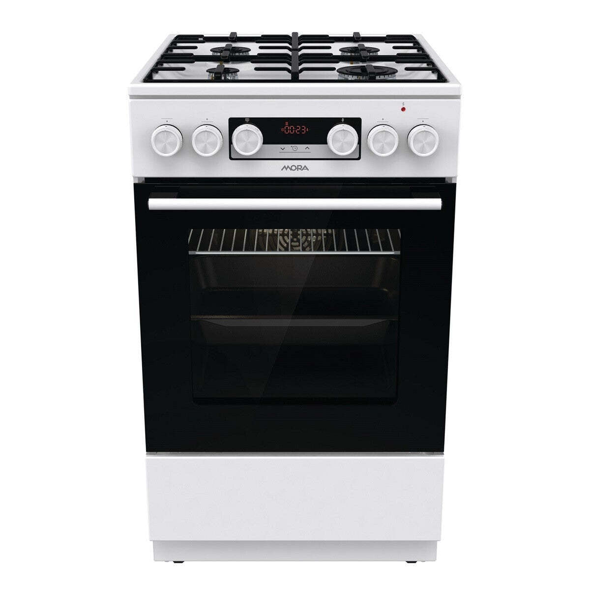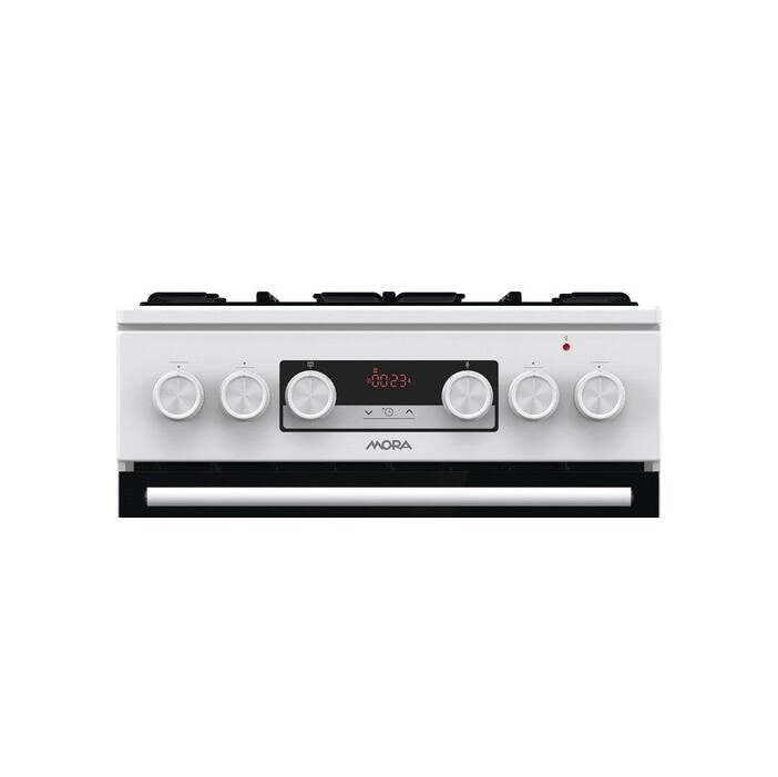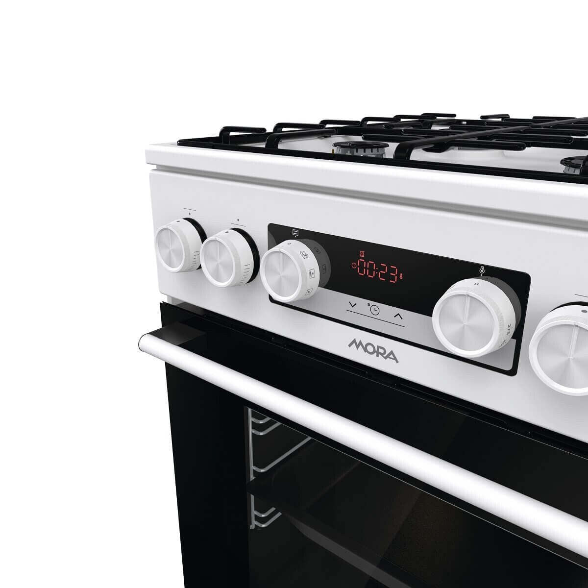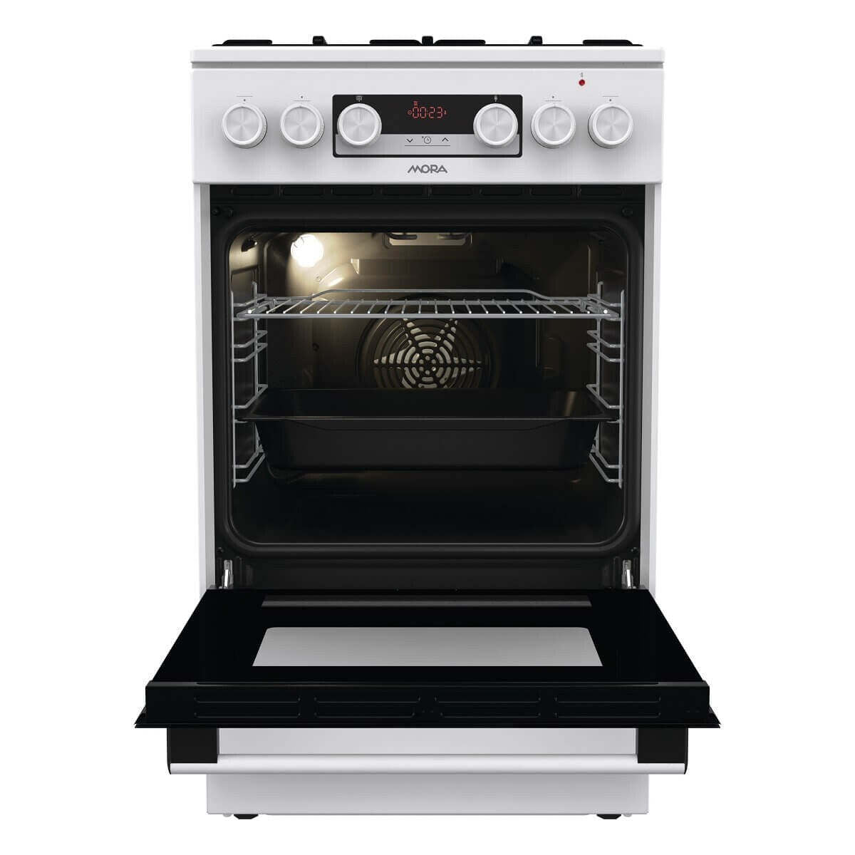 Kombinovaný sporák Mora v klasickom bielom prevedení oplýva plynovou doskou so štyrmi horákmi a výkonnou rúrou s regulovateľnou teplotou od 50 do 275 °C. Zariadenie poteší aj chladnými dvierkami alebo ľahkým čistením Eco Clean. |