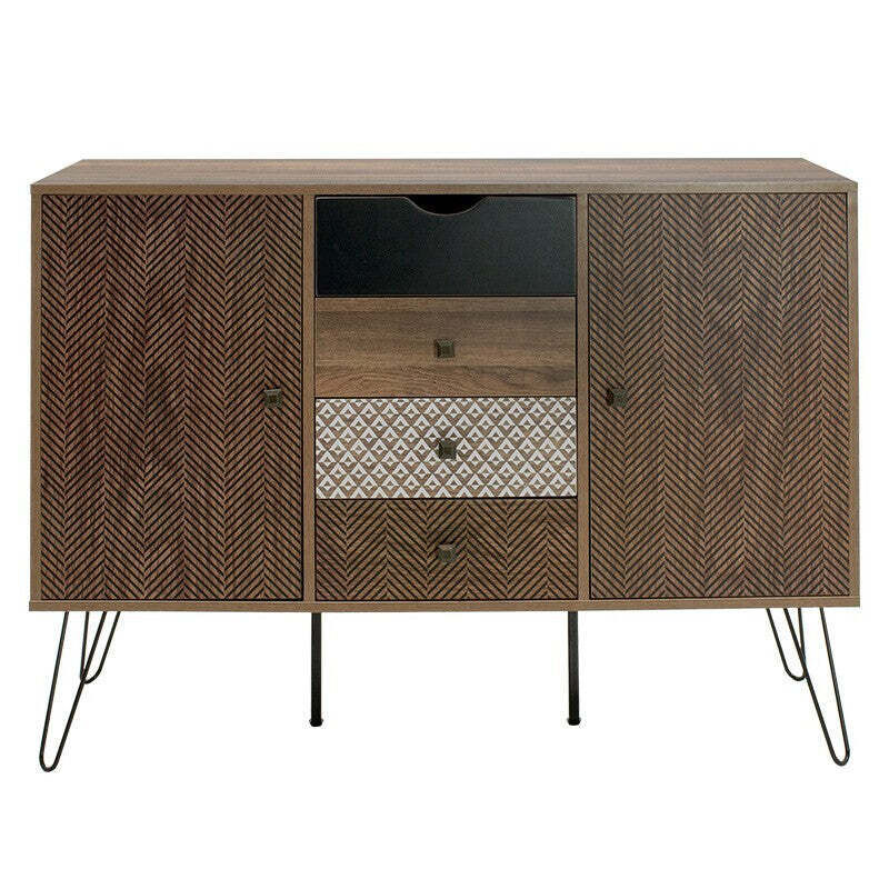 Komoda do obývačky JonsiKomoda Jonsi vás upúta už svojím atraktívnym dizajnom. Vďaka kombinácii hnedého odtieňa a dekorovania geometrickými vzormi sa bude skvele hodiť do každého interiéru, pričom sa stane vkusným a nevšedným doplnkom. Iste sa stane predmetom obdivu nejednej návštevy. Jevyrobená z MDF a LDTD odolného proti namáhaniu a opotrebeniu.Celkový vzhľad podčiarkujú elegantné čierne kovové nohy, ktoré zvýraznia nábytok ako celok.Komoda disponuje bohatým úložným priestorom so štyrmi zásuvkami a dvomi policami v skrinkách, pričom ďalší priestor vzniká na hornej ploche.