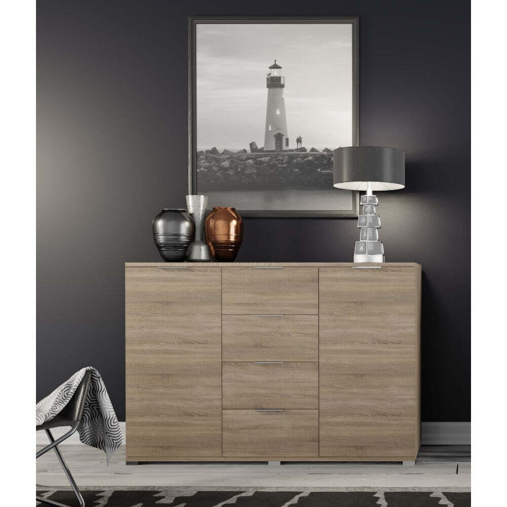 Štýlová komoda PulsanoViacúčelová komoda Pulsano je veľmi praktický pomocník vhodný do obývacej izby či spálne, ktorý ponúka veľkorysý úložný priestor členený do štyroch zásuviek a dvoch dvierok, ktoré vám pomôžu uložiť vaše veci a mať ich tak prehľadne usporiadané. Sivé úchytky dopĺňajú komodu o štýlový dizajnový prvok. Na komodu môžete umiestniť dekoračné predmety či fotografie, ktoré sa na ňu budú skvele vynímať. Komoda je zhotovená z kvalitných laminovaných drevotrieskových dosiek (LDTD). Vzhľadovo je prevedená v prírodnom dekore duba, takže bez problémov zapadne medzi ostatný nábytok. Sivé nízke nôžky poskytujú komode stabilitu a pevnosť. Precízne spracovanie a použité materiály zaručujú vysokú kvalitu, odolnosť, dlhoročnú životnosť a jednoduchú údržbu.
