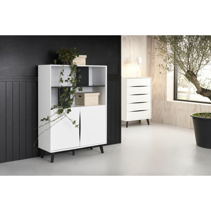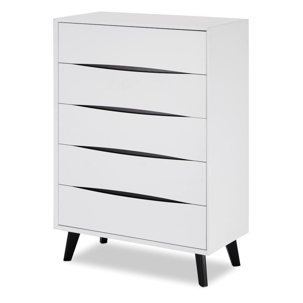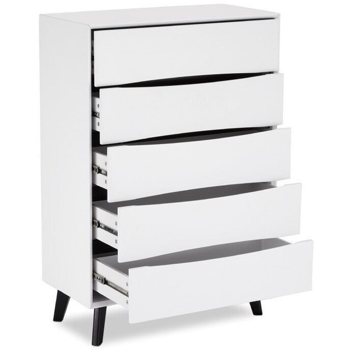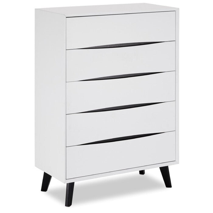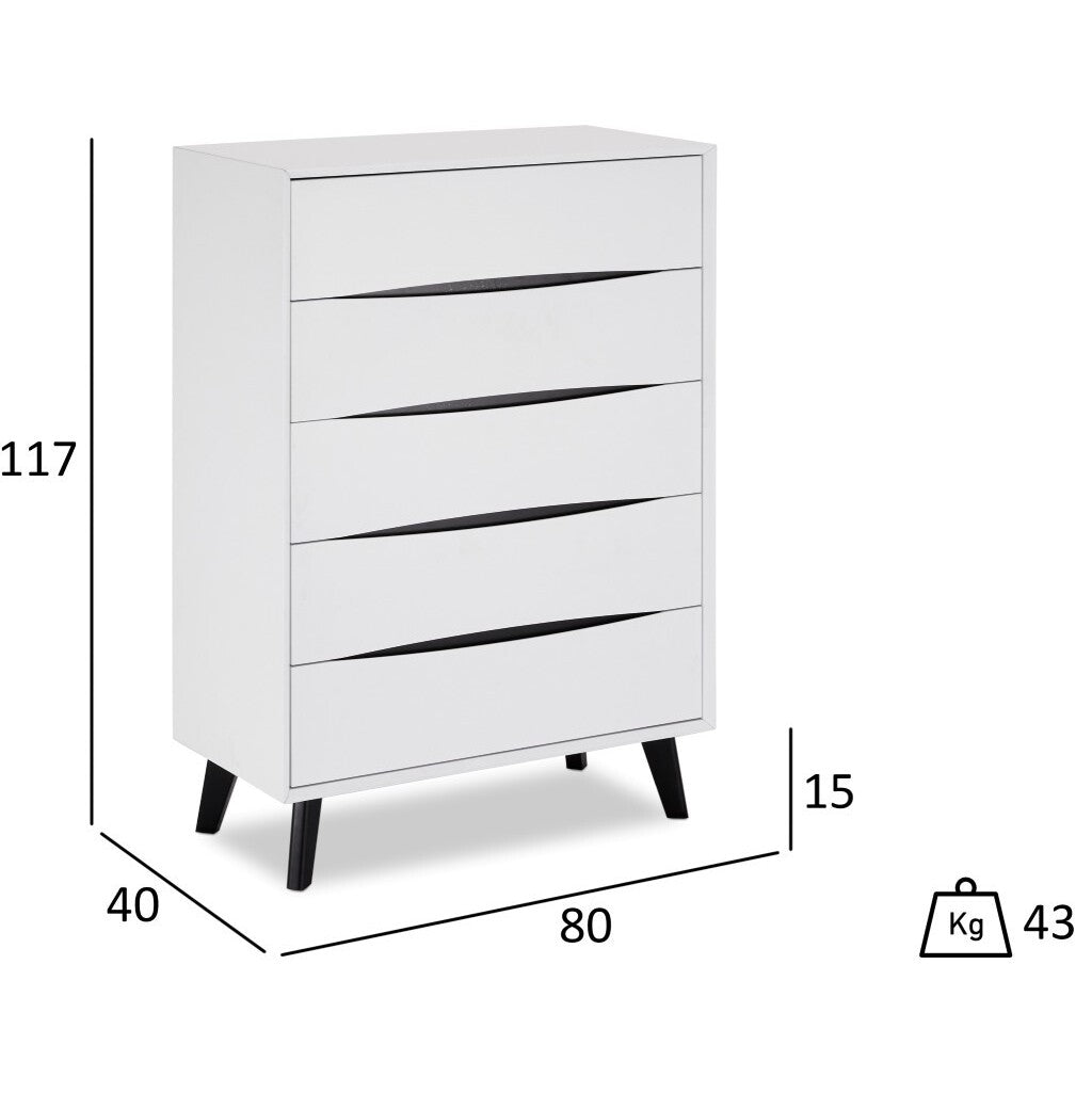Biela komoda SensZásuvková komoda Sens je skvelým riešením, keď vám doma chýba úložný priestor. Je štýlová, pútavá a navyše praktická. Vďaka kombinácii bielej a čiernej farby skvele doplní ktorúkoľvek miestnosť. 5 praktických zásuviek zaisťuje dostatok úložného priestoru. Hornú dosku môžete navyše využiť na vystavenie dekoračných alebo iných predmetov. Komoda je vyrobená z materiálu MDF, čo je záruka dlhej životnosti. Tento materiál sa tiež ľahko udržuje. Čierne drevené nožičky sa zase postarajú o stabilitu komody.