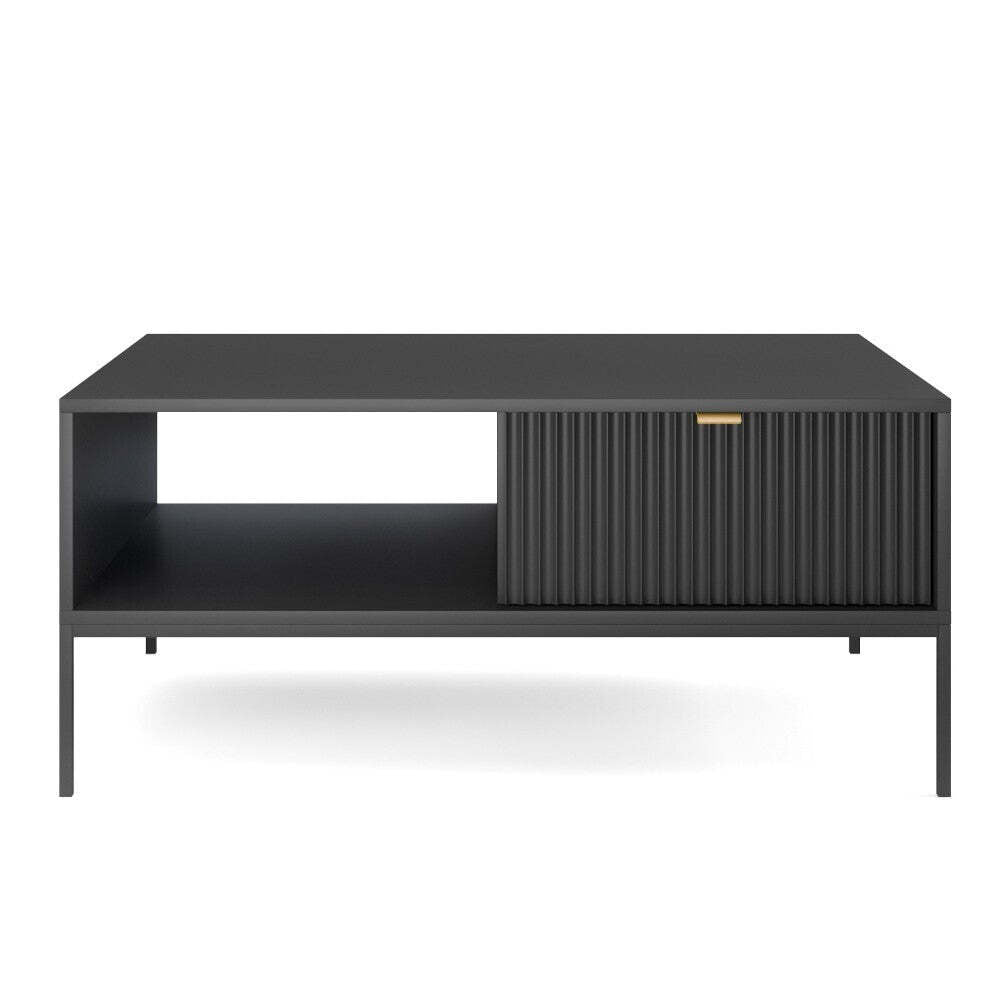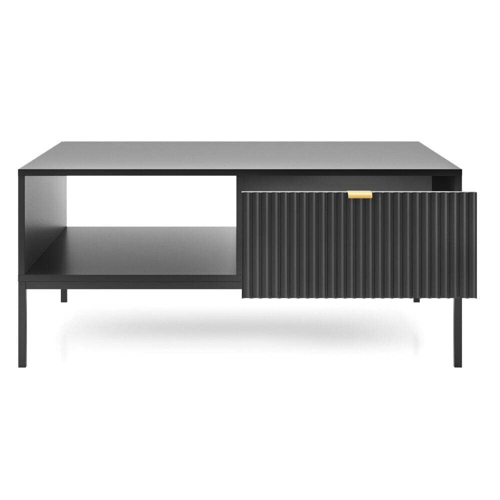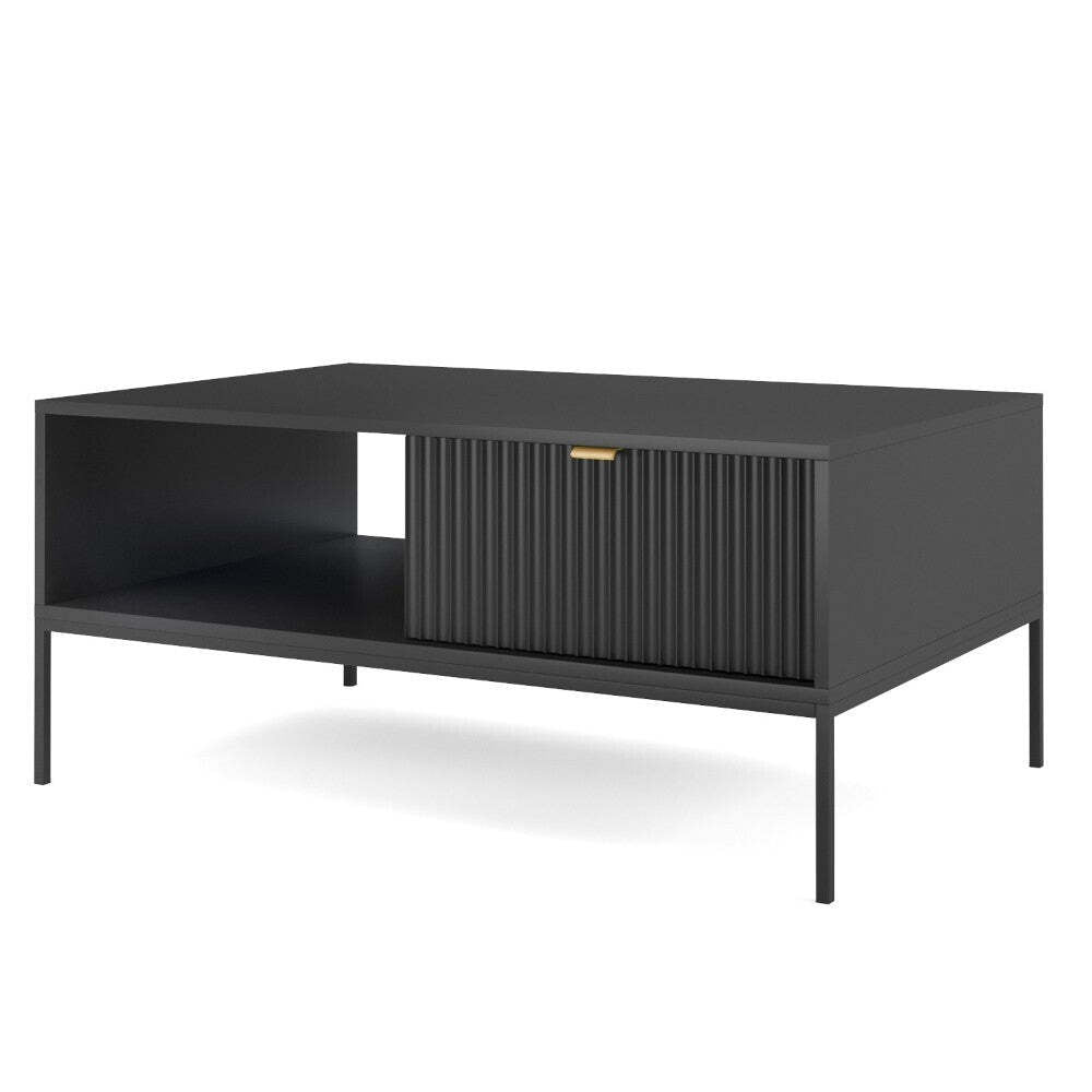 Moderný konferenčný stolík LoretPokiaľ si vybavujete vašu domácnosť a túžite po modernom a štýlovom nábytku do vašej obývačky, je štýlový konferenčný stolík Loret tou pravou voľbou. Ide o veľmi luxusný kus nábytku, ktorý skvele zapadne do každého interiéru. Kvalitné spracovanie dodáva stolíku dlhú životnosť a vysokú odolnosť. Stolík disponuje voľnou odkladacou doskou, na ktorú je možné odložiť všetko, čo chcete mať ihneď po ruke, ako napríklad televízny ovládač či časopis. Ďalšia voľná plocha sa nachádza pod doskou stola, rôzne drobnosti si môžete uložiť do dvoch menších zásuviek, ktoré sú situované oproti sebe. Zásuvky sú doplnené o kovové úchytky v zlatej farbe, ktoré spoločne s drážkovaným vzorom na prednej ploche vytvárajú zaujímavý prvok, o ktorý je stolík obohatený. Konferenčný stolík Loret je zhotovený z laminovaných drevotrieskových dosiek (LDTD) v kombinácii drevovláknitých dosiek (MDF) v klasickej čiernej farbe. Vysoké kovové nôžky dodávajú stolíku pevnú stabilitu a napomáhajú k ľahkému upratovaniu, ľahko pod neho zájdete vysávačom či mopom. K stolíku si môžete dokúpiť ďalší nábytok z rovnomenného programu a kompletne si tak vybaviť váš interiér. |