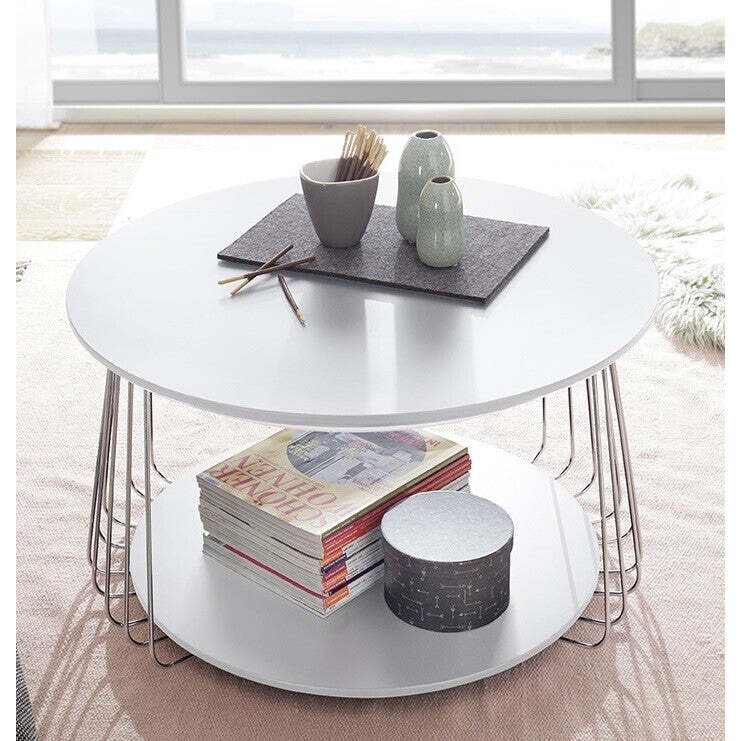 Okrúhly konferenčný stolík SelvanKonferenčný stolík Selvan v tvare kruhu sa stane praktickým doplnkom vášho interiéru. Okrúhly konferenčný stolík ponúka 2 dostatočne priestranné odkladacie plochy, na ktoré môžete odložiť najrôznejšie predmety. Kombinácia MDF dosiek s kovovou konštrukciou zaručuje stabilitu a dlhú životnosť stolíka. Vďaka vyhotoveniu dosiek v bielej farbe a konštrukcie v dekore chróm tak biely konferenčný stolík zapadne do väčšiny interiérov.