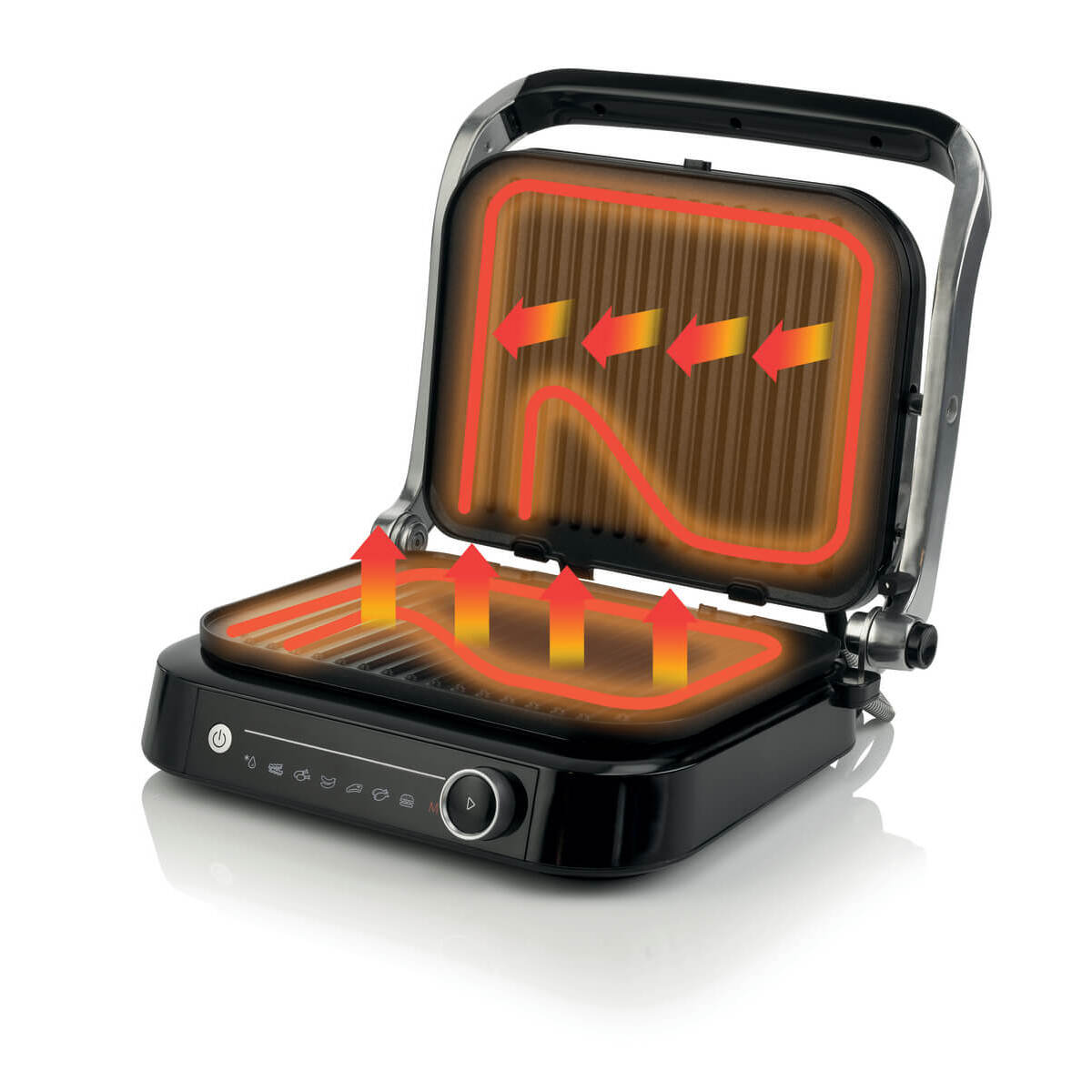 Žiadne teplotné stratyNa kontrolu grilovaného jedla už nie je nutné otvárať veko. Stačí jediný pohľad na ovládací panel a hneď zistíte, v akej fáze sa proces grilovania práve nachádza, a to bez akýchkoľvek teplotných strát. So svetelnými aj zvukovými signálmi nikdy neprepásnete ten pravý moment, kedy je potrebné pokrm vybrať. |