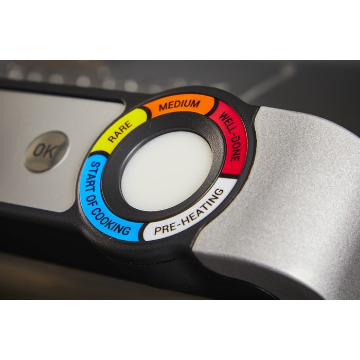 Zakaždým dokonalý steakSnímač v priebehu niekoľkých sekúnd zistí počet porcií, zmeria ich hrúbku a potom automaticky nastaví správnu teplotu a čas grilovania, aby ste si zaistili ten najchutnejší plátok mäsa, aký ste kedy jedli. Samozrejmosťou je aj svetelný indikátor a zvukový signál. Tieto dve funkcie vám umožňujú sledovať priebeh grilovania - prepečenosť, stredne prepečenosť alebo dobre prepečenosť. |
