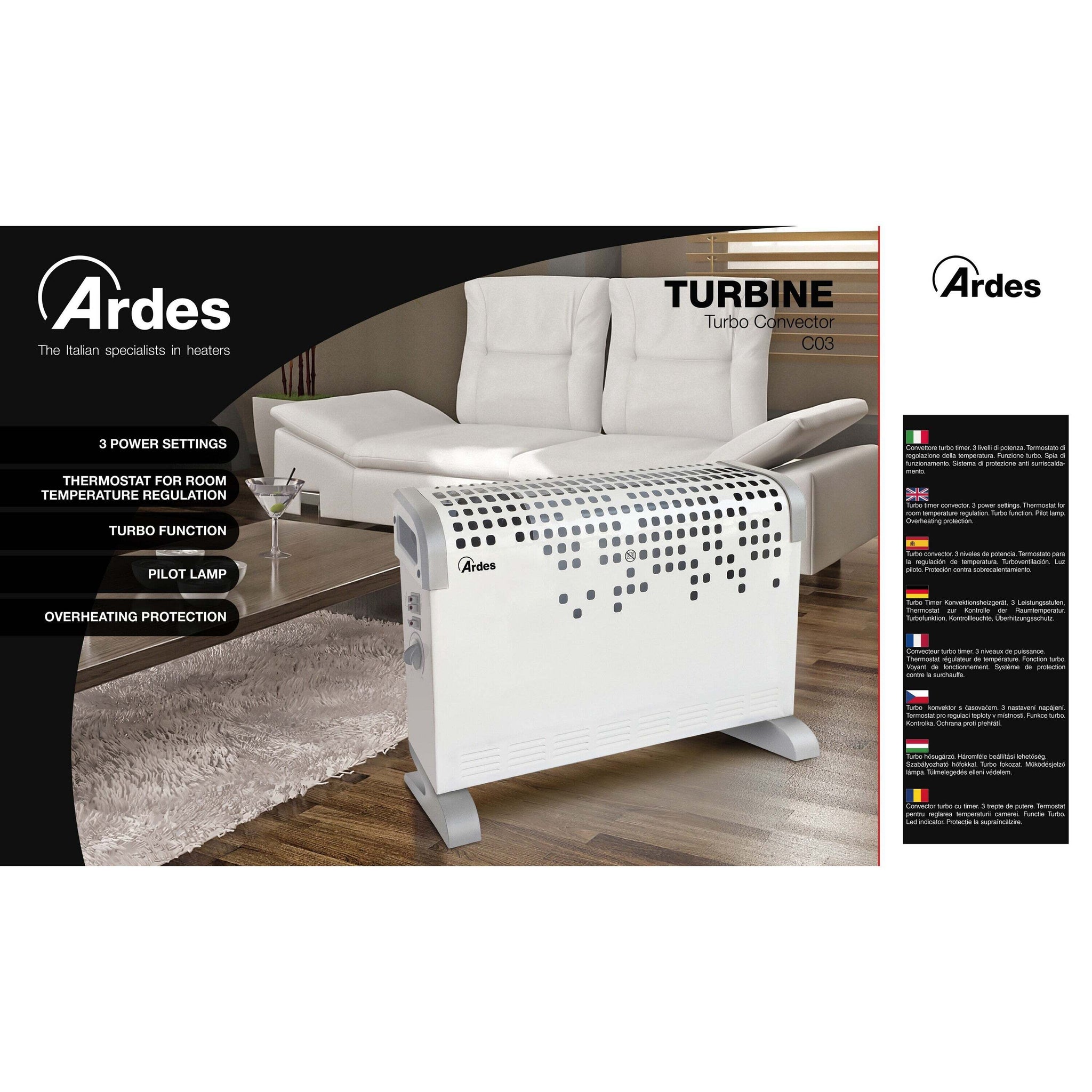 Ardes 4C03 je samostatne stojaci TURBO konvektor s termostatom o výkone až 2000 W.Prostredníctvom ovládacieho panelu možno nastaviť úroveň vykurovania a termostatom regulovať teplotu. Ponúka možnosť pripevnenia na stenu. Vhodné použitie je v miestnosti do 55 m3. Vďaka systému AIR MIX dochádza k dokonalému prúdeniu vzduchu. Ďalej je vybavený automatickým vypínačom pri jeho prevrhnutí. Medzi jeho hlavné prednosti patrí aj bezhlučná prevádzka.