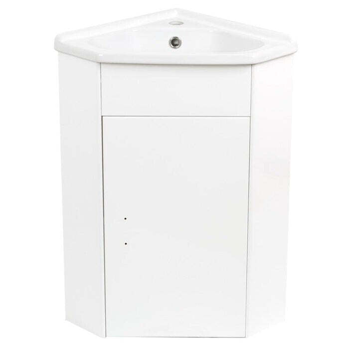 Rohová kúpeľňová skrinka s umývadlom Cara MiaRohová kúpeľňová skrinka Cara Mia ponúka keramické umývadlo, pod ktorým sa nachádza úložný priestor. V ňom môžete mať všetko prehľadne uložené a vaša kúpeľňa bude stále vyzerať uprataná. Rohová skrinka do kúpeľne má biele lakované boky aj predné plochy v lesklom vyhotovení, vďaka čomu ideálne zapadne do väčšiny kúpeľní. Súčasťou balenia sú 3 kusy nožičiek. Skrinka je dodávaná zmontovaná, môžete ju tak začať okamžite používať. Vďaka svojim rozmerom sa skvele hodí do menších kúpeľní.