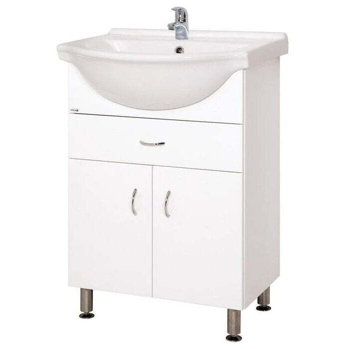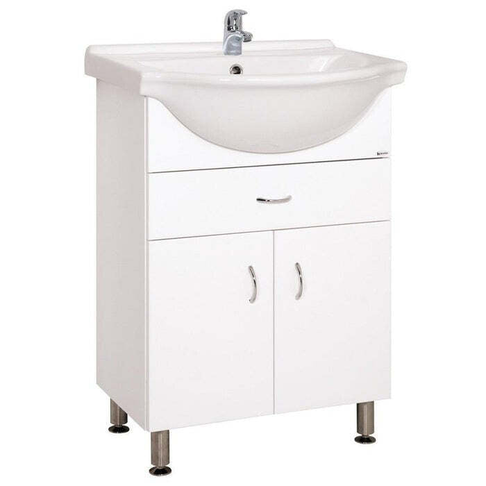 Kúpeľňová skrinka s umývadlom Cara MiaMenšia kúpeľňová skrinka Cara Mia ponúka keramické umývadlo, pod ktorým sa nachádza úložný priestor v podobe zásuvky a 2 dvierok. V nich môžete mať všetko prehľadne uložené a vaša kúpeľňa bude stále vyzerať uprataná. Umývadlová skrinka má biele lakované boky aj predné plochy v lesklom vyhotovení, vďaka čomu ideálne zapadne do väčšiny kúpeľní. Súčasťou balenia sú úchytky a 4 výškovo nastaviteľné nerezové nožičky. Skrinka je dodávaná zmontovaná, môžete ju tak začať okamžite používať.