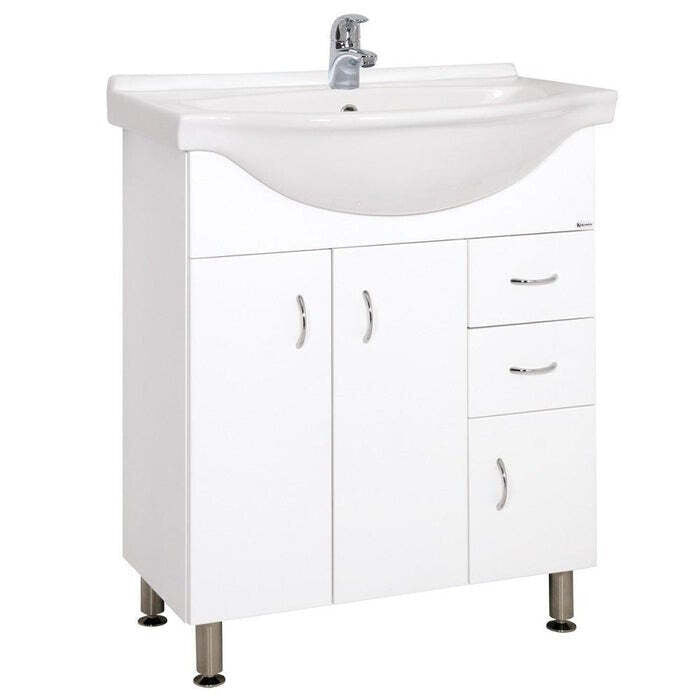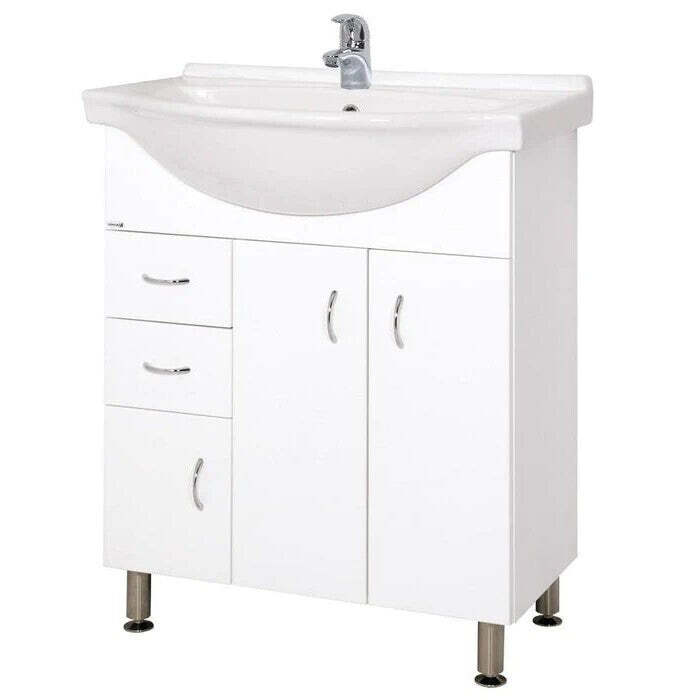 Kúpeľňová skrinka s umývadlom Cara MiaKúpeľňová skrinka Cara Mia ponúka keramické umývadlo, pod ktorým sa nachádza prakticky členený úložný priestor. V ňom môžete mať všetko prehľadne uložené a vaša kúpeľňa bude stále vyzerať uprataná. Umývadlová skrinka má biele lakované boky aj predné plochy v lesklom vyhotovení, vďaka čomu ideálne zapadne do väčšiny kúpeľní. Súčasťou balenia sú úchytky a 4 výškovo nastaviteľné nerezové nožičky. Skrinka je dodávaná zmontovaná, môžete ju tak začať okamžite používať.