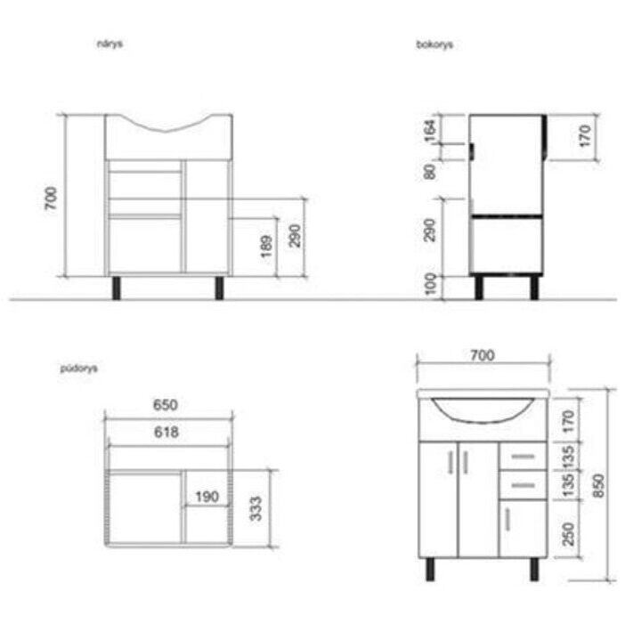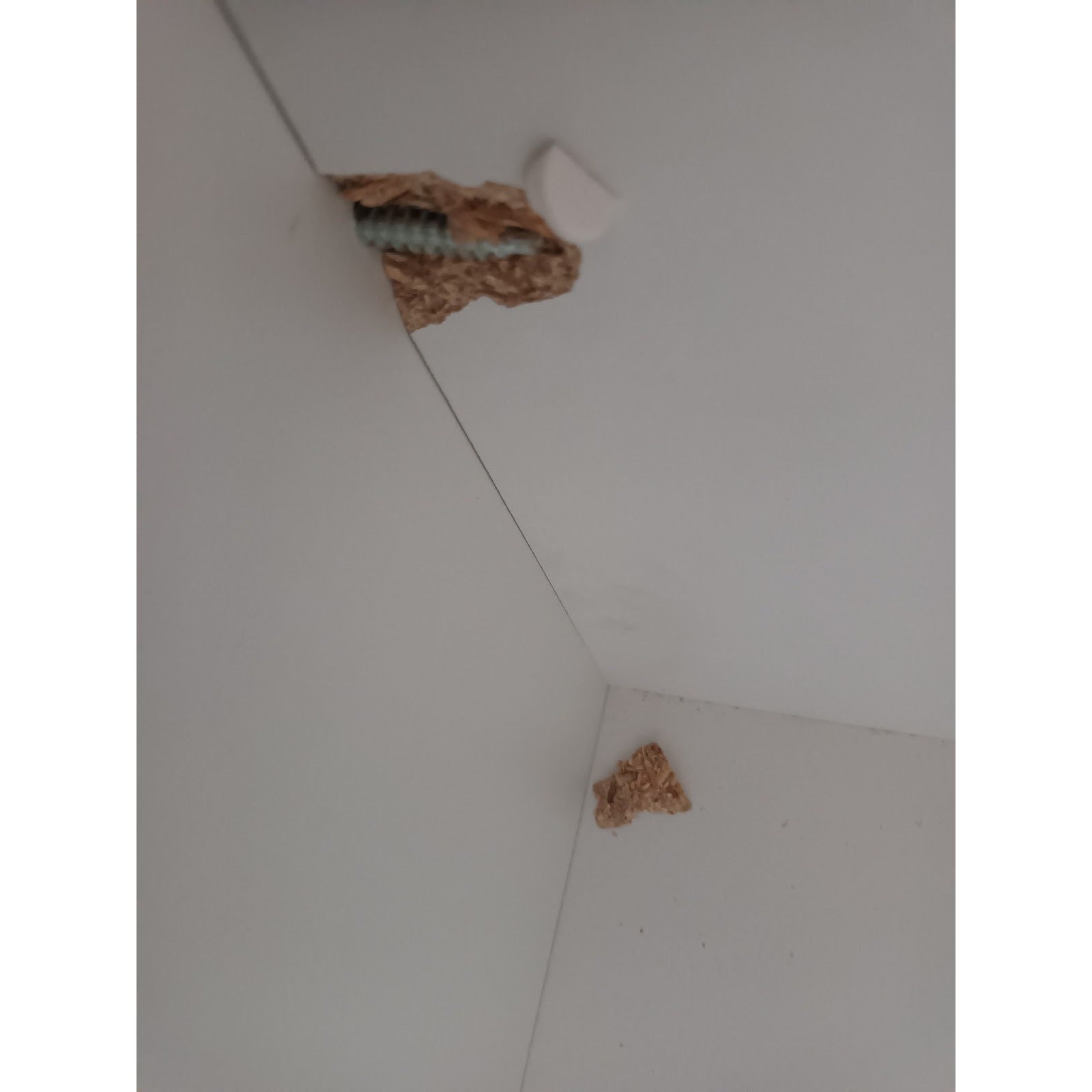 Poškodená skrinka, odštiepnutý kus dosky, zložené, rozpratané spoje, chýba umývadlo