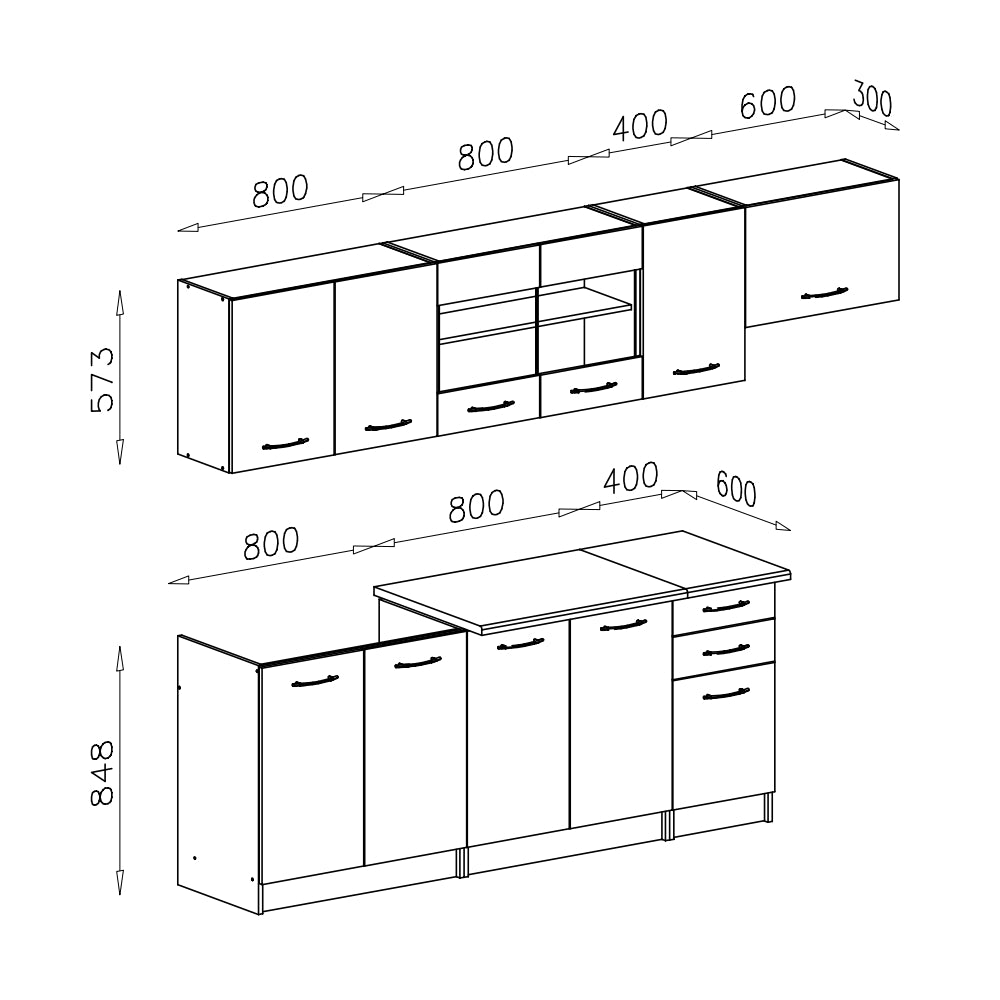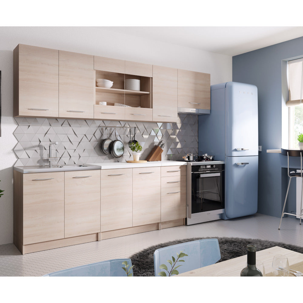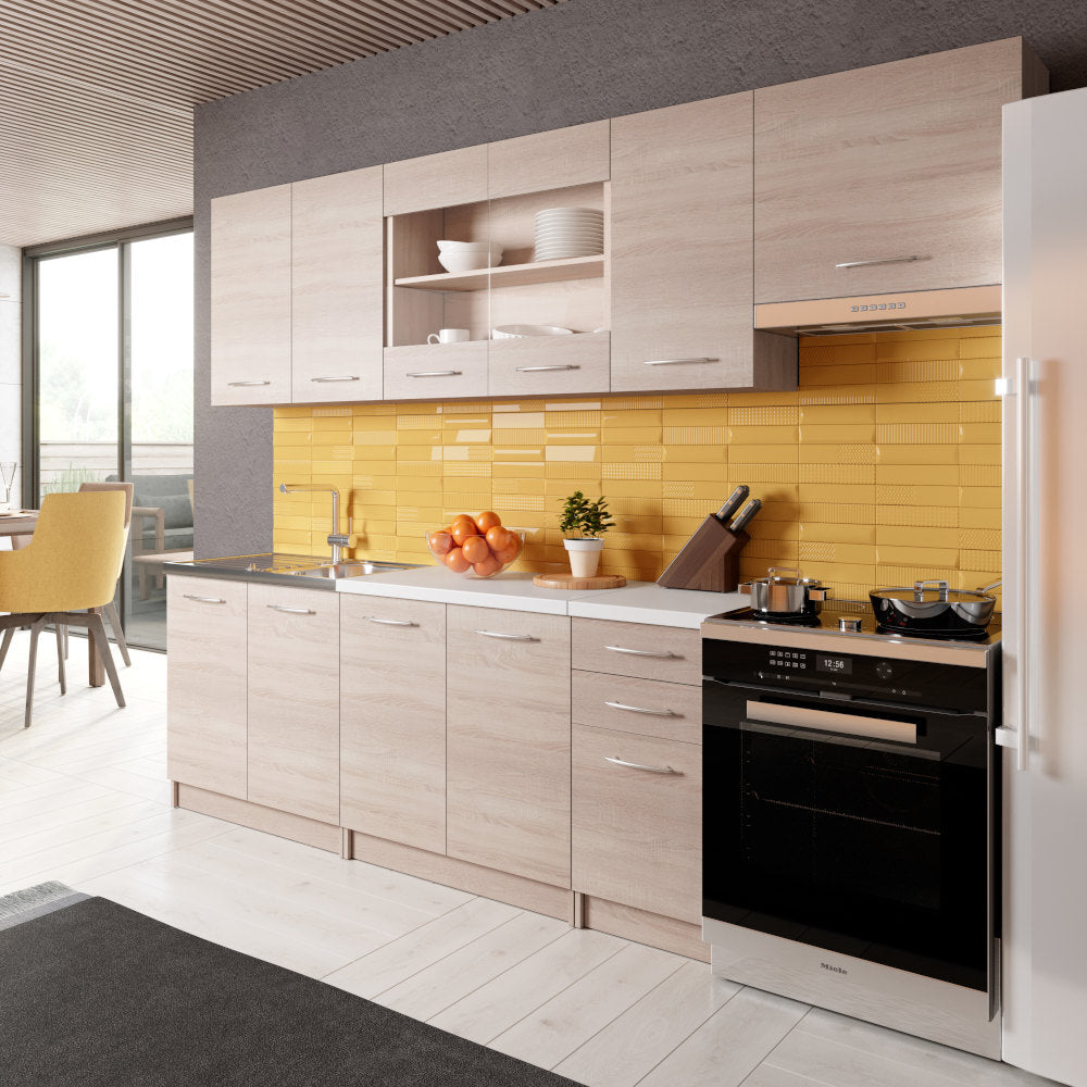 Paloma 2 je skvelou voľbou na štýlové zariadenie kuchyneKuchyňa Paloma 2 vytvorí vo vašej domácnosti dokonalé miesto, kde sa vám bude dobre variť, kde sa budete cítiť pohodlne a príjemne. Kombinuje moderný a veľmi elegantný vzhľad s praktickým a systematicky usporiadaným úložným priestorom. Dekor kuchyne je z väčšej časti vyrobený z duba sonoma a eleganciu dopĺňa pracovná doska v bielej farbe. Vďaka matnej povrchovej úprave pôsobí táto kombinácia veľmi moderne. Horná sklenená skrinka na pravej strane kuchyne vás určite zaujme. Spolu s ďalšími 3 hornými skrinkami, z ktorých jedna je nad odsávačom pár , a 3 spodnými skrinkami ponúka kuchyňa Paloma veľkorysý úložný priestor. Pri stavbe kuchyne sa myslelo aj na rúru a sporák, na ktoré je tu priestor. K dvom spodným skriniam sa dodáva delená pracovná doska s hrúbkou 38 mm.K drezovej skrinke odporúčame zakúpiť plnohodnotný drez (800 x 600 mm), táto skrinka neobsahuje pracovnú dosku. Pracovná doska kuchynskej linky Paloma 2 je vyhotovená v bielej farbe. Je rozdelená na dve časti. Väčšia (80x60 cm) je určená pre dvojdverovú skrinku a menšia (40x60 cm) pre úzku skrinku so zásuvkami. Hrúbka pracovnej dosky je 38 mm.
