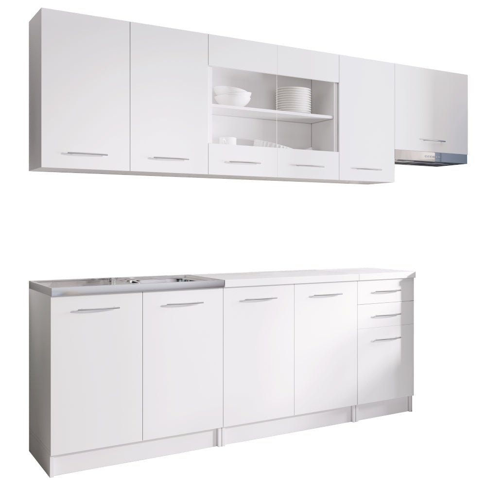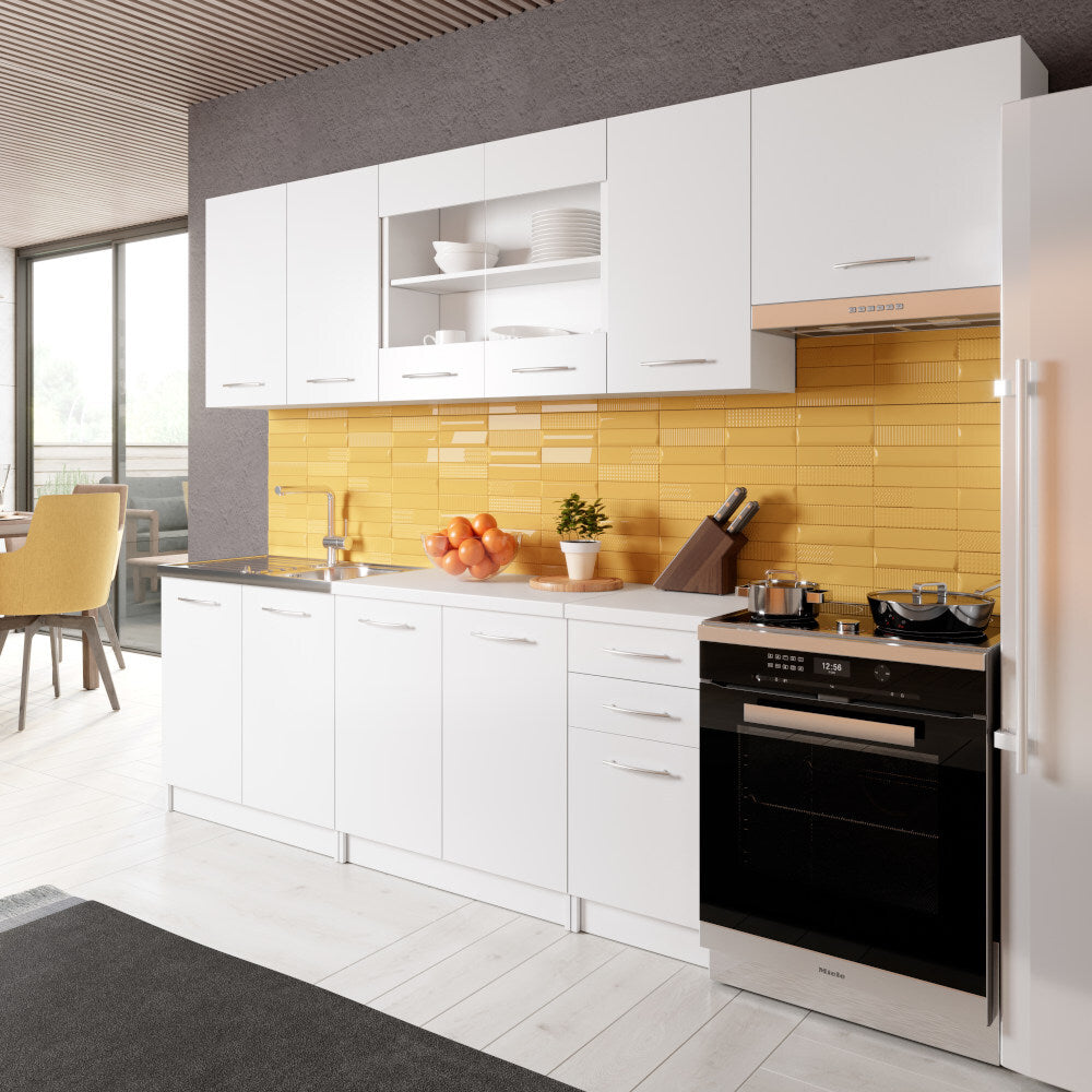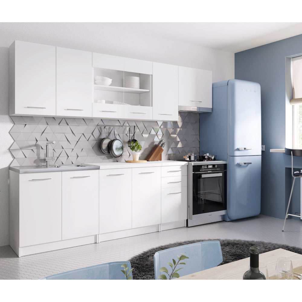 Paloma 2 je skvelou voľbou na štýlové zariadenie kuchyneKuchyňa Paloma 2 vytvorí vo vašej domácnosti dokonalé miesto, kde sa vám bude dobre variť, kde sa budete cítiť pohodlne a príjemne. Kombinuje moderný a veľmi elegantný vzhľad s praktickým a systematicky usporiadaným úložným priestorom. Kuchyňa je vyhotovená v elegantnej bielej far be s matným povrchom , táto kombinácia pôsobí veľmi elegantne. Váš pohľad upúta horná sklenená skrinka napravej strane kuchyne.Spolu s ďalšími 3 hornými skrinkami, z ktorých jedna je nad digestorom, a 3 spodnými skrinkami ponúka kuchyňa Paloma veľkorysý úložný priestor. Pri stavbe kuchyne sa myslelo aj na rúru a sporák, na ktoré je tu priestor. K dvom spodným skriniam sa dodáva delená pracovná doska s hrúbkou 28 mm.K drezovej skrinke odporúčame dokúpiť plnohodnotný drez (800x600 mm), táto skrinka neobsahuje pracovnú dosku. Pracovná doska kuchynského bloku Paloma 2 je vyhotovená v bielej farbe. Je rozdelená na dve časti. Väčšia (80x60 cm) je určená pre dvojdverovú skrinku, menšia (40x60 cm) pre úzku skrinku so zásuvkami. Hrúbka pracovnej dosky je 28 mm.
