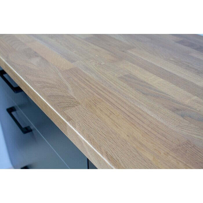 Moderná kuchyňa LisaKuchyňa Lisa vás zaujme hneď v niekoľkých smeroch. Oceníte jej rozsiahly a prakticky členený úložný priestor, moderný dizajn a prínosné mechanické prvky. Dekor grafitu na predných plochách v kontraste s dubovou pracovnou doskou pôsobí veľmi pekne a dodáva kuchyni Lisa elegantný vzhľad. 2 horné, 3 spodné skrinky a vysoký panel na vstavanú rúru poskytujú dostatok priestoru na prehľadné uloženie riadu, pochutín a ingrediencií na varenie. Predné plochy majú matnú povrchovú úpravu, na ktorej nie je vidno odtlačky rúk tak veľmi ako na lesklom povrchu. Túto vlastnosť ocenia predovšetkým rodiny s malými deťmi. Pracovná doska so šírkou 180 cm tvorí jednoliaty celok, čo je výhodné najmä z hľadiska jej údržby. Celý jej povrch je hladký a neobsahuje ryhy v miestach, kde na seba nadväzujú pracovné dosky zložené z viacerých dielov. Čistenie plochy je tak podstatne ľahšie. Elegantný vzhľad kuchyne Lisa dotvárajú čierne kovové úchytky, ktoré jemne zvýrazňujú tmavý tón grafitového podkladu.
