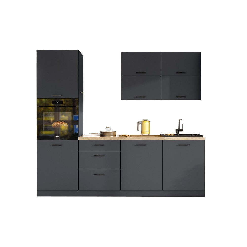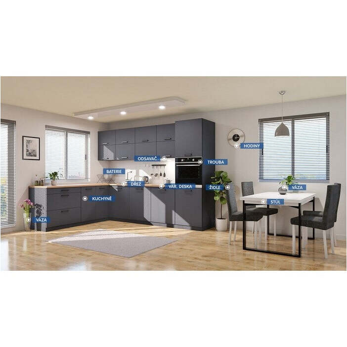 Kuchyňa Lisa je ideálnou voľbou pre zariadenia centrálnej miestnosti vašej domácnosti, ktorou kuchyňa nepochybne je. Trávime v nej veľa času a je preto dôležité, aby sme sa v nej cítili dobre. Kuchyňa Lisa k tomu môže významně prispieť. Je vyrobená z kvalitných materiálov, skonštruovaná veľmi prakticky, ponúka dostatok úložného aj pracovného priestoru a okrem toho vyzerá veľmi elegantne. Zaujme vás predovšetkým sivou farbou v odtieni grafit v matnej povrchovej úprave. V kombinácii s pracovnou doskou v drevenom dekore pôsobí celkový dizajn veľmi príjemne. Dĺžka kuchyne je 240 cm a vďaka tomu ponúka naozaj veľkorysý úložný priestor.