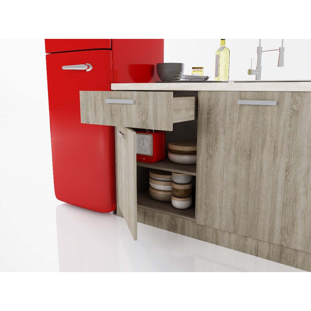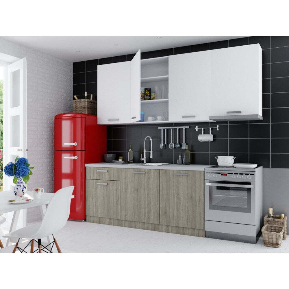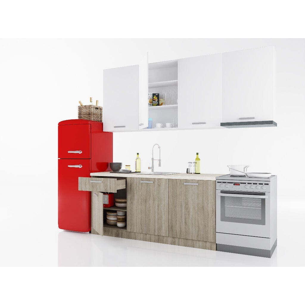 Varte v príjemnom a modernom prostredí s kuchyňou SienaElegantná kuchynská linka Siena vám ponúkne perfektné prostredie, v ktorom bude radosť variť. Vďaka modernému dizajnu sa v nej budete cítiť veľmi príjemne, k čomu prispeje aj praktické rozmiestnenie jej jednotlivých prvkov. Celá, 240 cm dlhá kuchynská linka je tvorená piatimi skrinkami, ktoré vám dohromady ponúkajú veľké množstvo úložného priestoru, doplnenými 180 cm dlhou pracovnou doskou. Horná časť kuchynskej zostavy sa skladá z troch skriniek. Jednu dvojdverovú a jednu jednodverovú dopĺňa horná digestorová skrinka, zatiaľ čo v spodnej časti nájdete skrinky dve, jednu dvojdverovú a jednu jednodverovú s hornou zásuvkou. Dvierka všetkých skriniek sú vybavené funkciou tlmeného zatvárania, ktoré z vašej kuchyne eliminujú zvuk búchajúcich dvierok. Skrinky v spodnej časti kuchyne sú navyše vybavené výškovo nastaviteľnými nožičkami, ukrytými za soklom, ktorý je súčasťou kuchyne. Súčasťou kuchynskej linky je aj priestor pre samostatne stojaci sporák. Moderný dizajn a elegantný vzhľad predstavujú jednu z hlavných výhod sektorovej kuchynskej linky Siena. Kombinácia dekoru duba sonoma s bielou farbou presvetlí váš interiér a nabije vás pozitívnou energiou kedykoľvek začnete variť. Okrem toho vás tiež poteší fakt, že na výrobu kuchyne boli použité kvalitné laminované drevotrieskové dosky (LDTD), ktoré vynikajú svojou odolnosťou proti oderu a krátkodobej vlhkosti, čím výrazne uľahčujú údržbu celej kuchyne. Na odstránenie drobných nečistôt vám tak bude stačiť len bežný saponát a vlhká handrička, alebo špongia na riad. |