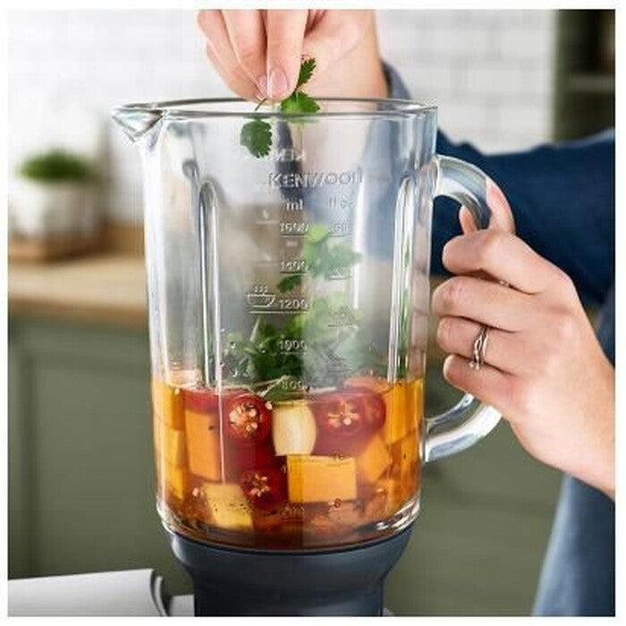 Súčasťou príslušenstva je sklenený mixér ThermoResist ™. Sklenený mixér je vyrobený z borosilikátového skla, ktoré je odolné voči vysokým aj nízkym teplotám. Objem nádoby je 1,6 l a dokonalé rozmixovanie zabezpečia 4 nože z nehrdzavejúcej ocele. Umožňuje prechod medzi miešaním horúcich a zmrznutých surovín, bez obáv z prasknutia alebo poškodenia. Hravo si poradí s rozmixovaním polievok alebo drvením ľadu.