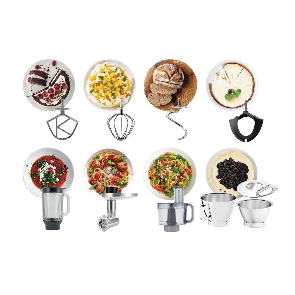 Súčasťou robota je sklenený mixér ThermoResist ™, ktorý je odolný voči vysokým aj nízkym teplotám. Objem nádoby je 1,6 l a dokonalé rozmixovanie zabezpečia 4 nože z nehrdzavejúcej ocele. Na sekanie, krájanie a strúhanie slúži praktický Food Processor vyrobený z vysoko odolného materiálu Tritan ™ so sekacími nožmi z nehdzavejúce ocele a šiestich precíznych strúhacich diskov. Mlynček na mäso zase vďaka pevnej kovovej konštrukcii tela, slimákovemu hriadeľu a plničke, ľahko namelie mäso, ryby, tvrdé syry, ovocie i zeleninu.