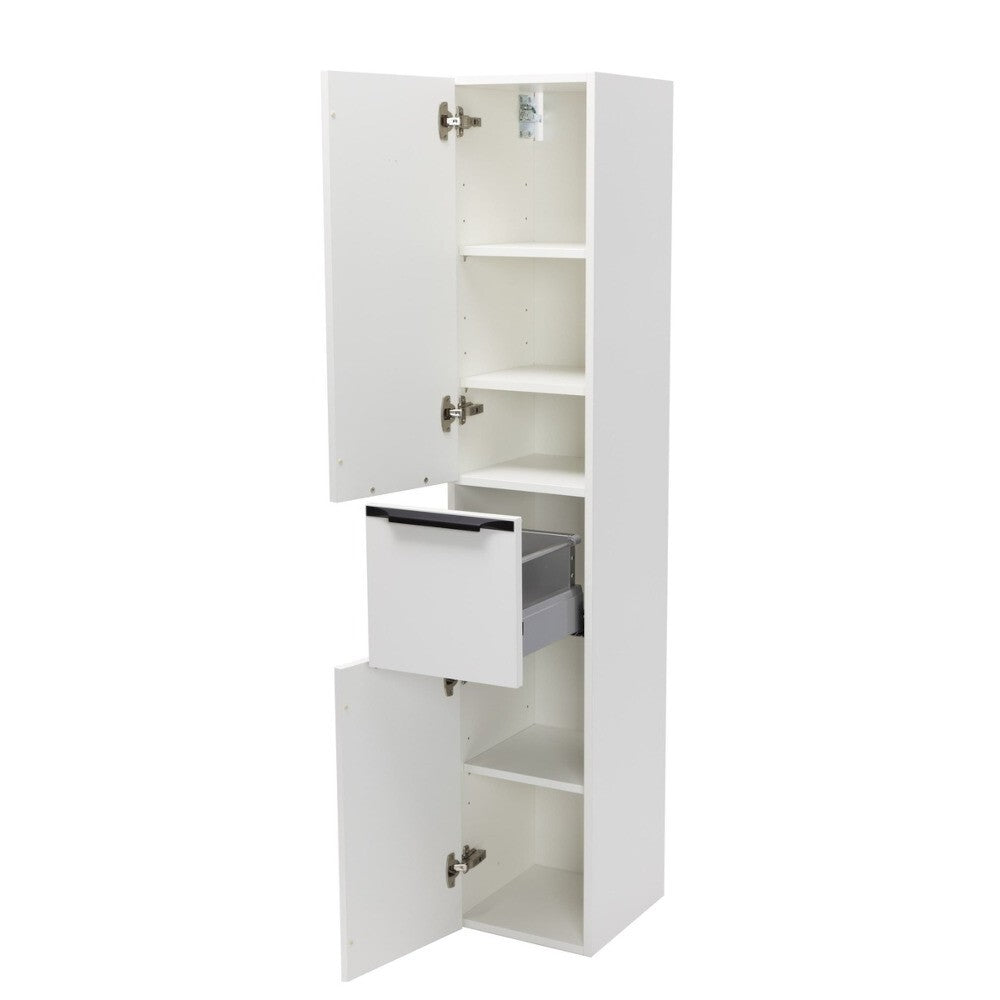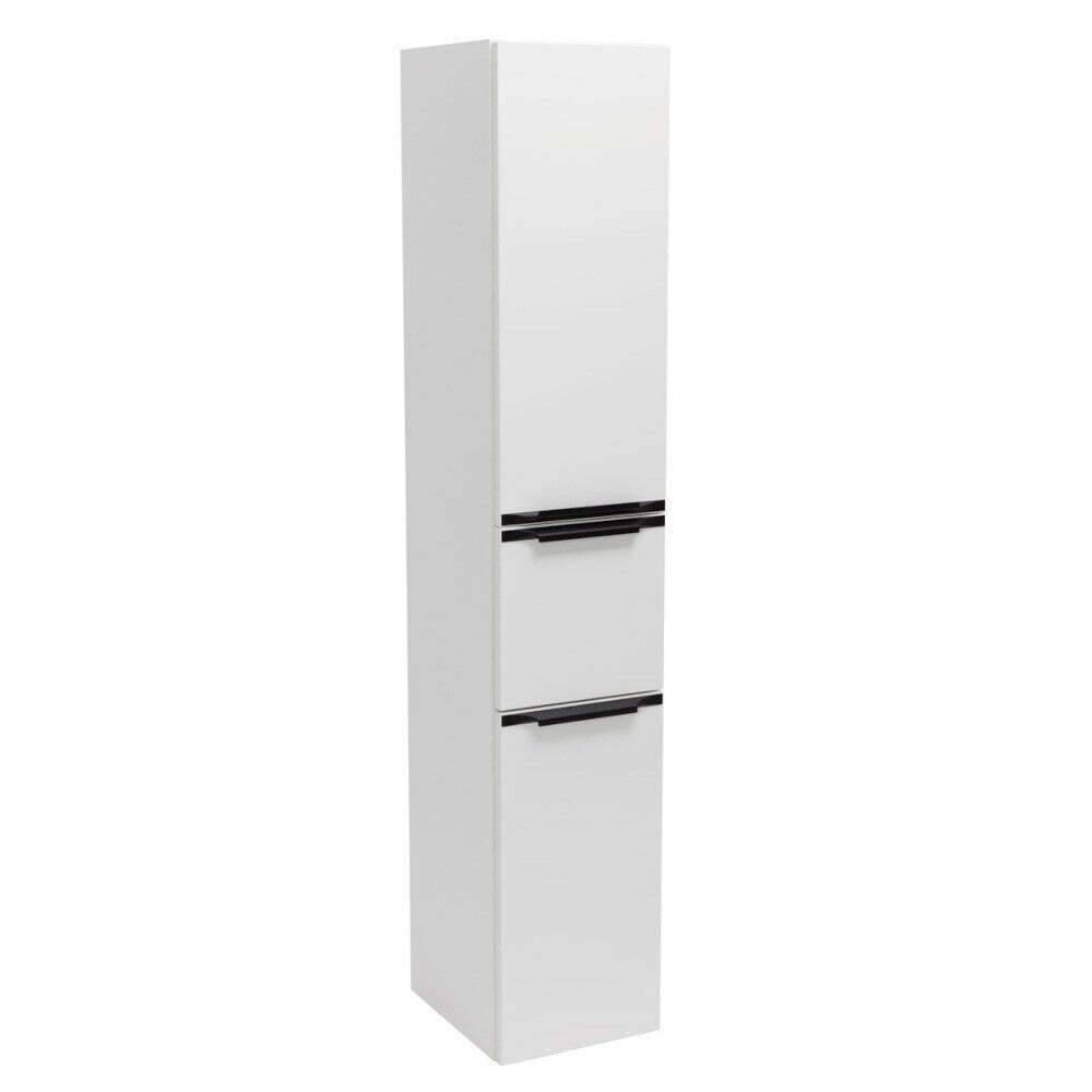 Vysoká závesná kúpeľňová skrinka DionneVysoká závesná kúpeľňová skrinka Dionne sa stane dôležitým prvkom vo vašej kúpeľni. Disponuje dvoma dvierkami a jednou zásuvkou na uloženie všetkých vašich dôležitých kúpeľňových doplnkov, aby ste ich mohli mať neustále po ruke. Vďaka tomu bude vaša kúpeľňa vyzerať stále upratané. Dvierka a zásuvka sú vybavené mechanizmom pomalého zatvárania, čo napomáha k ich ľahkej manipulácii. Otváranie dvierok je nastavené na ľavú stranu, podľa toho si treba prispôsobiť kúpeľňový interiér. Na čelách dvierok a zásuvky sú decentné madlá v čiernom dekore, ktoré obohacujú skrinku o elegantný prvok. Skrinka je dodávaná zmontovaná, môžete ju tak začať okamžite používať. Je vyrobená z kvalitných lakovaných laminovaných drevotrieskových dosiek (LDTD) v lesklej povrchovej úprave v bielom dekore. LDTD materiál je známy pre svoju ľahkú údržbu a dlhú životnosť.