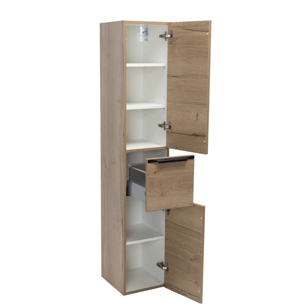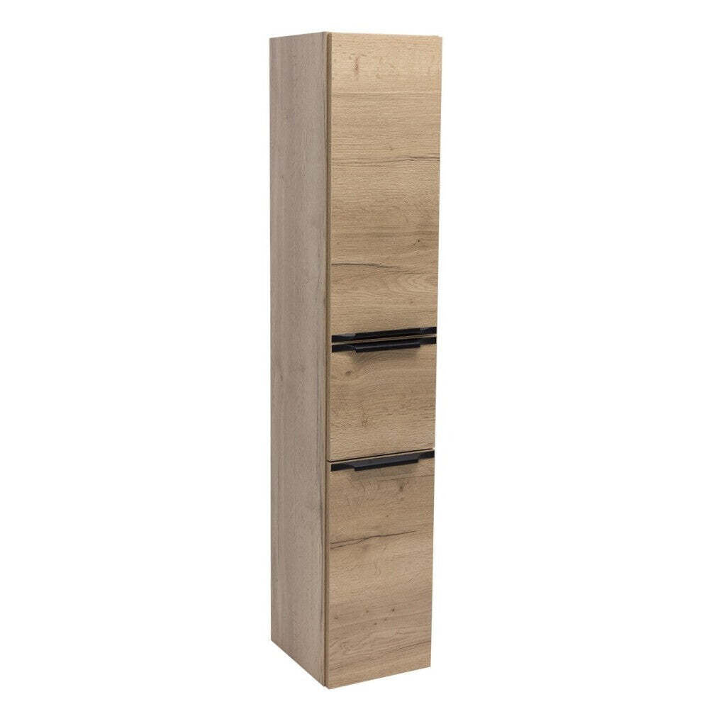 Vysoká závesná kúpeľňová skrinka DionneVysoká závesná kúpeľňová skrinka Dionne sa stane dôležitým prvkom vo vašej kúpeľni. Disponuje dvoma dvierkami a jednou zásuvkou na uloženie všetkých vašich dôležitých kúpeľňových doplnkov, aby ste ich mohli mať neustále po ruke. Vďaka tomu bude vaša kúpeľňa vyzerať stále upratané. Dvierka a zásuvka sú vybavené mechanizmom pomalého zatvárania, čo napomáha k ich ľahkej manipulácii. Otváranie dvierok je nastavené na pravú stranu, podľa toho si treba prispôsobiť kúpeľňový interiér. Na čelách dvierok a zásuvky sú decentné madlá v čiernom dekore, ktoré obohacujú skrinku o elegantný prvok. Skrinka je dodávaná zmontovaná, môžete ju tak začať okamžite používať. Je vyrobená z kvalitných lakovaných laminovaných drevotrieskových dosiek (LDTD) v matnej povrchovej úprave v dekore duba sierra. LDTD materiál je známy pre svoju ľahkú údržbu a dlhú životnosť.