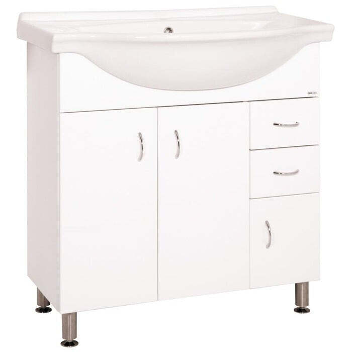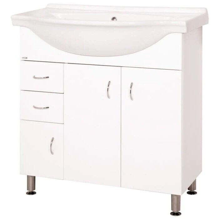 Kúpeľňová skrinka s umývadlom Cara MiaKúpeľňová skrinka Cara Mia ponúka keramické umývadlo, pod ktorým sa nachádza prakticky členený úložný priestor. V ňom môžete mať všetko prehľadne uložené a vaša kúpeľňa bude stále vyzerať uprataná. Umývadlová skrinka má biele lakované boky aj predné plochy v lesklom vyhotovení, vďaka čomu ideálne zapadne do väčšiny kúpeľní. Súčasťou balenia sú úchytky a nerezové nožičky. Skrinka je dodávaná zmontovaná, môžete ju tak začať okamžite používať.