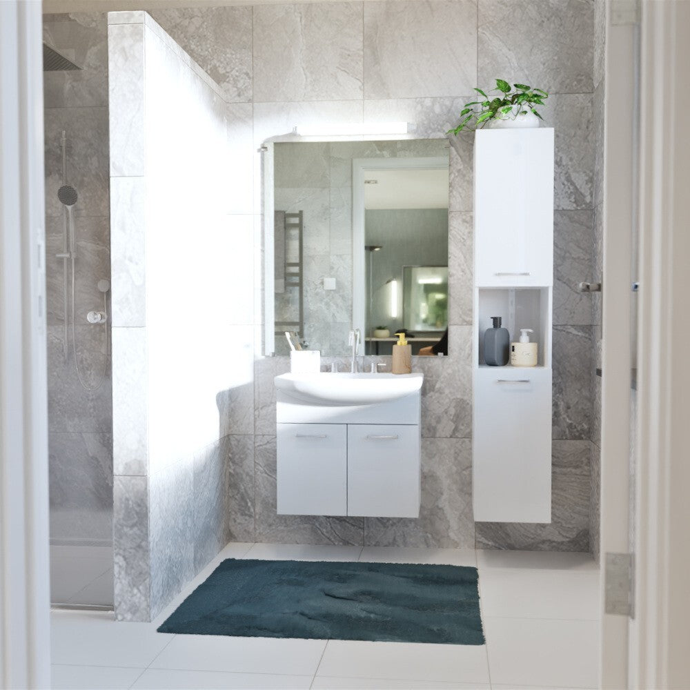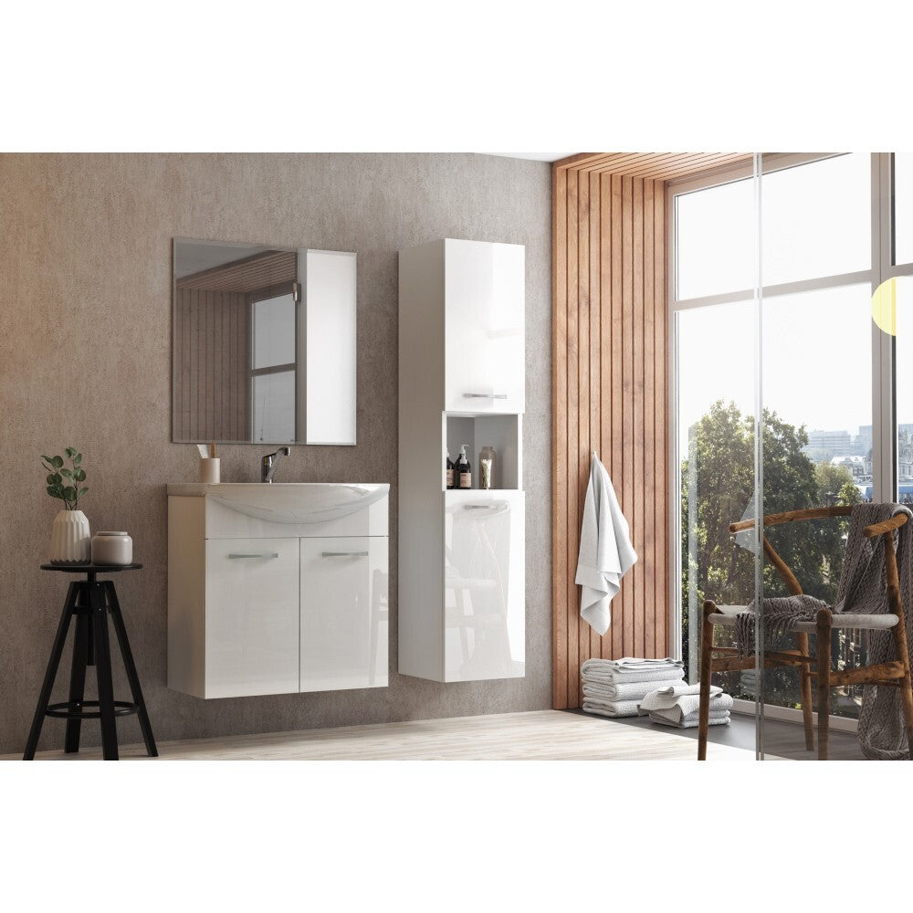 Kúpeľňová zostava CarinePraktická kúpeľňová zostava Carine sa stane nepostrádateľným nábytkom vo vašej kúpeľni. Obsahuje spodnú skrinku s umývadlom a vysokú skrinku, ktoré ponúka bohatý úložný priestor, vďaka ktorému budete mať v kúpeľni všetko prehľadne uložené, ihneď po ruke a navyše vaša kúpeľňa bude stále vyzerať upratané. Súčasťou zostavy je aj zrkadlo, ktoré vám pomôže pri kontrole vášho zovňajšku a vďaka ktorému bude kúpeľňová zostava úplne kompletná. Dekor v bielej farbe s lesklou úpravou a kovovými úchytkami v striebornej farbe skvele zapadne do väčšiny kúpeľní. Materiál zostavy je z kvalitnej laminovanej drevotrieskovej dosky (LDTD), ktorý zostave zaisťuje dlhú životnosť a jednoduchú údržbu. |