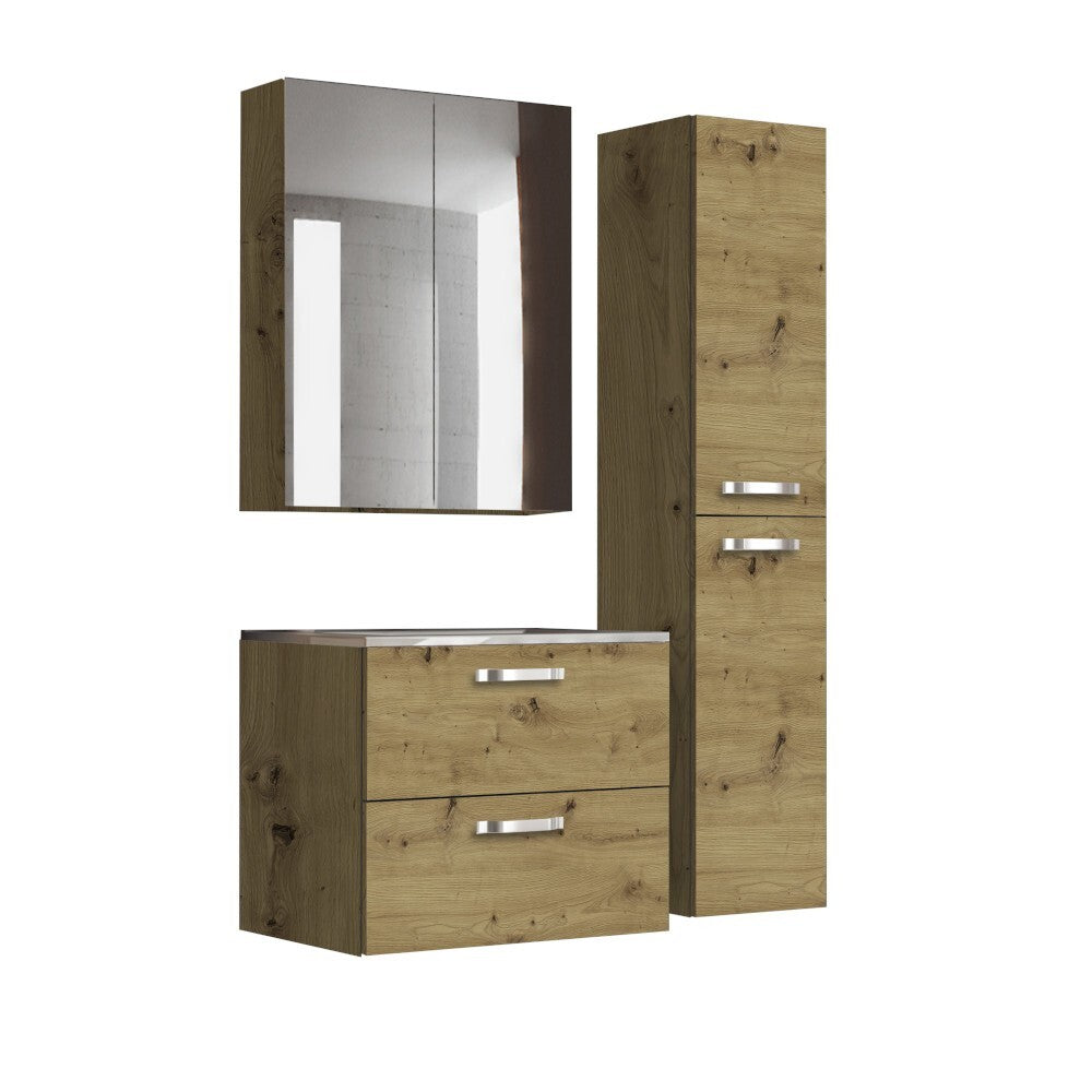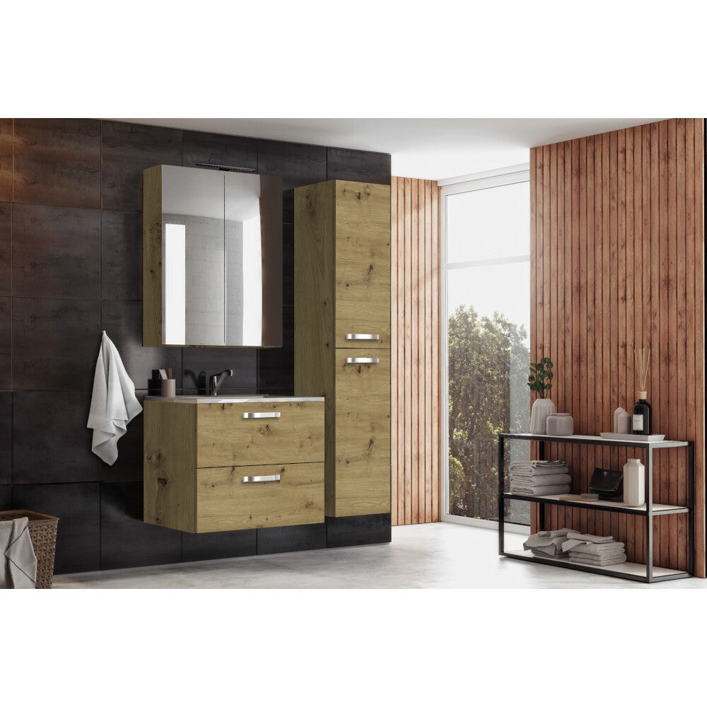 Kúpeľňová zostava GrenyaPraktická kúpeľňová zostava Grenya obsahuje spodnú skrinku s umývadlom, vysokú skrinku a skrinku so zrkadlom. Jej hlavnou výhodou je bohatý úložný priestor, vďaka ktorému budete mať v kúpeľni všetko prehľadne uložené a vaša kúpeľňa bude stále vyzerať upratané. Zrkadlo zase využijete pri kontrole svojho zovňajšku. Zásuvky disponujú tlmeným zatváraním. Dvierka v prírodnom dekore duba artisan skvele zapadnú do väčšiny kúpeľní. Materiál zostavy je z kvalitnej laminovanej drevotrieskovej dosky (LDTD), ktorá je známa pre svoju dlhú životnosť a jednoduchú údržbu. Osvetlenie nie je súčasťou skrinky. |