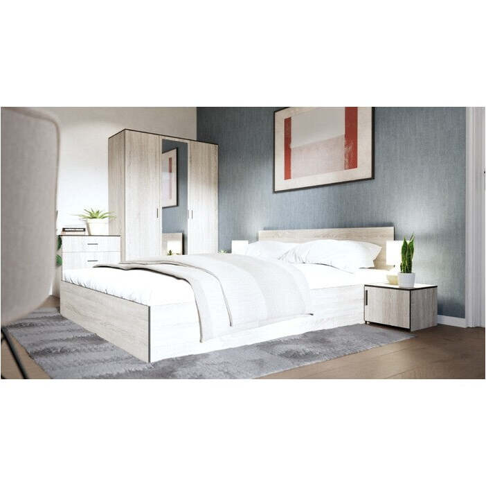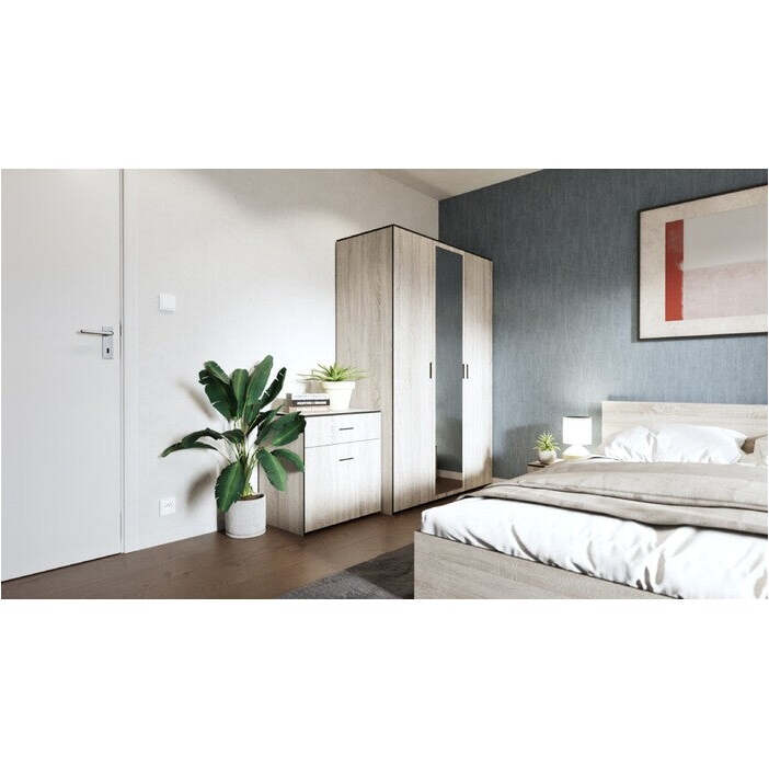 Spálňová zostava VernalSpálňová zostava Vernal obsahuje rám postele s nočnými stolíkmi, šatníkovú skriňu a komodu. Posteľ 160x200 cm je dostatočne priestranná pre dve dospelé osoby. Nočné stolíky pri bokoch postele zaistia odkladaciu plochu na knihu či mobilný telefón a drobný úložný priestor. Priestranná skriňa do spálne s tromi dverami, z ktorých jedny sú so zrkadlom, ponúka šatníkovú tyč aj poličky na uloženie všetkého oblečenia. Menšia komoda do spálne sa potom skvelo hodí na uskladnenie drobného oblečenia ako sú napríklad ponožky. Posteľ je dodávaná bez roštu, matraca a ďalších ilustračných doplnkov. Rošty si môžete kúpiť z našej ponuky e-shopu. Matrac si môžete vybrať ako jeden samostatnýmatrac 160x200 cm alebo dva matrace 80x200 cm. Nábytok do spálne je vyrobený z kvalitných drevotrieskových dosiek. Medzi prednosti tohto materiálu patrí odolnosť voči krátkodobej vlhkosti a drobnému mechanickému poškodeniu. Vyniká dlhou životnosťou a bezproblémovou údržbou. |