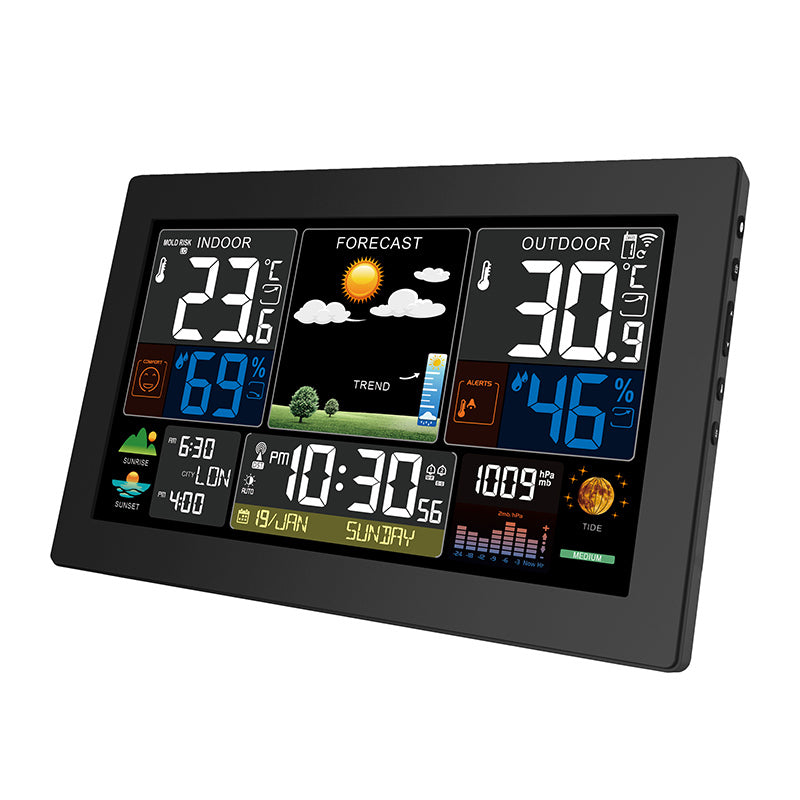 Prehľadný a veľký LCD displejVšetky informácie sa zobrazia na veľkom podsvietenom farebnom LCD displeji, takže prehľadne uvidíte, čo sa deje. Nájdete tu ukazovateľ batérie, rovnako ako hodiny aj kalendár. Zároveň umožňuje nastaviť si čas alarmu, takže ju môžete využiť ako budík. Vďaka praktickému stojanu je možné meteostanicu umiestniť na nočný stolík, ale rovnako ľahko ju pripevníte aj na stenu. O napájanie sa môžu postarať dve AAA batérie (nie sú v balení), ale aj adaptér DC 5V, 1200 mA. Dáta zaisťuje praktický senzor, ktorý môžete umiestniť až 60 m od prijímača. Jeho krytie je IP20, takže by nemal byť vystavený vode. Môžete súčasne pripojiť až tri. |