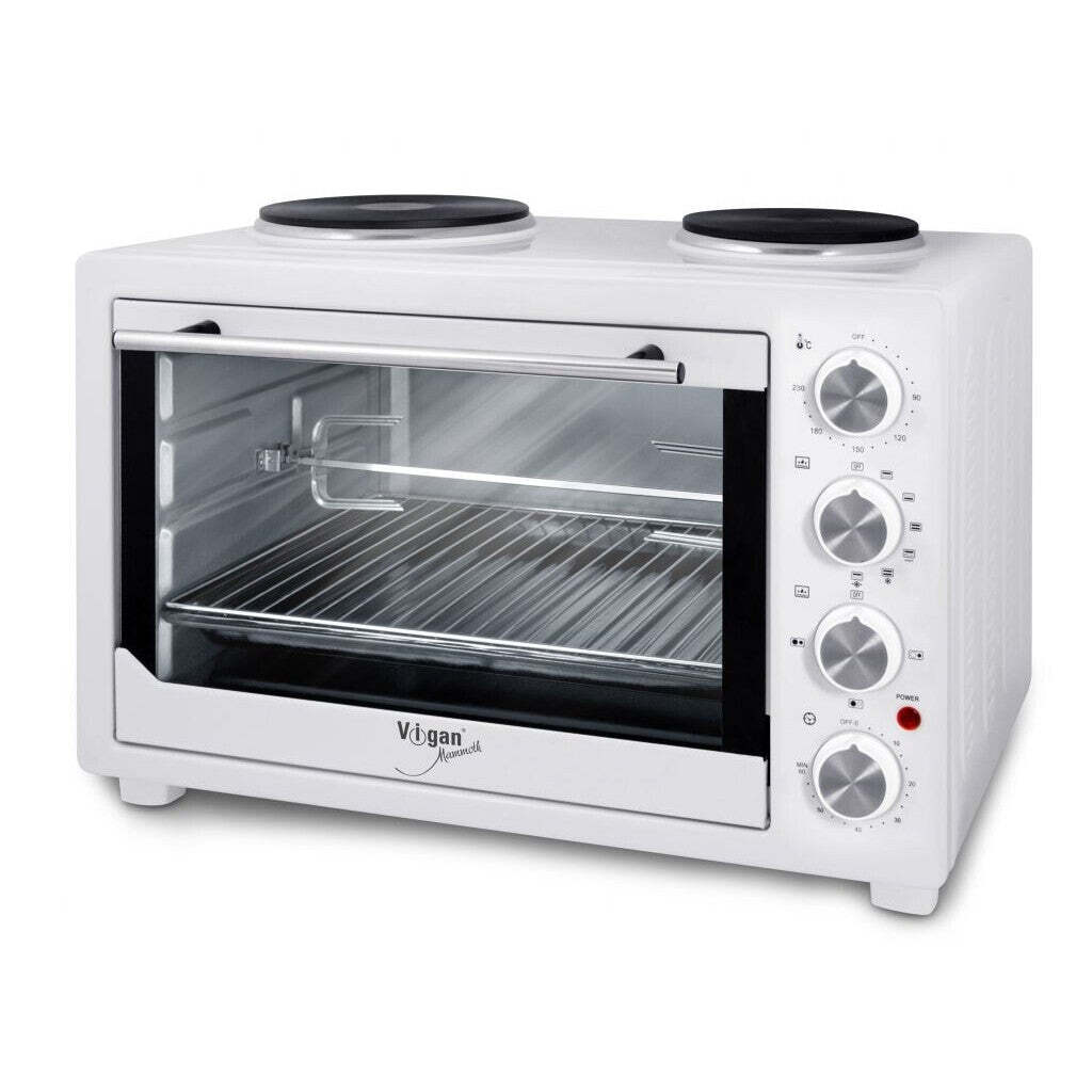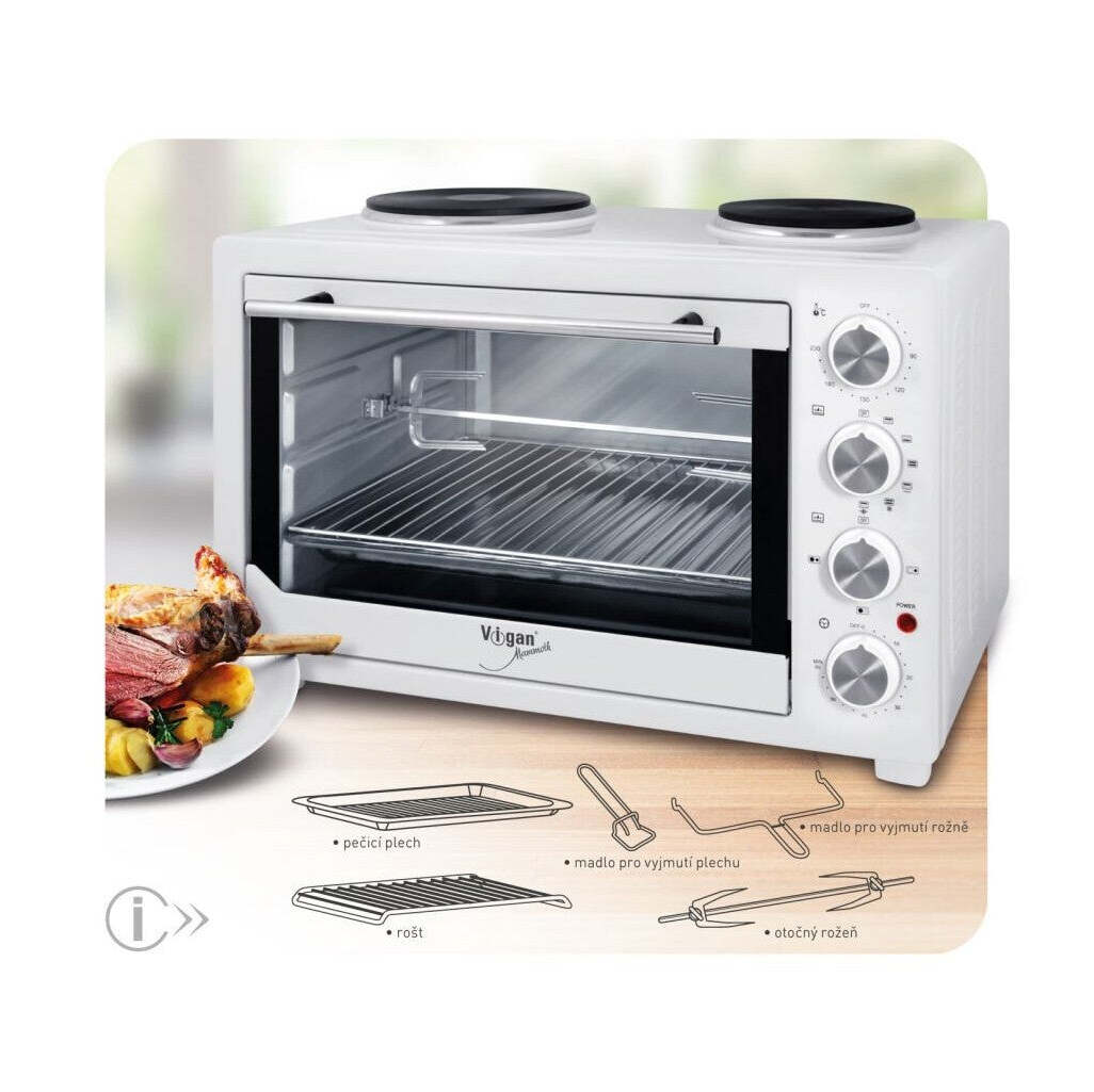 Elektrická rúra na pečenieElektrická rúra na pečenie s grilom s dvoma hornými platničkami. Vnútorný povrch je galvanizovaná oceľ. Dvojité sklenené dvierka s bezpečnostným sklom. Využitie nielen doma, ale aj na chalupách, chatách, ubytovniach, študentských internátoch a pod.