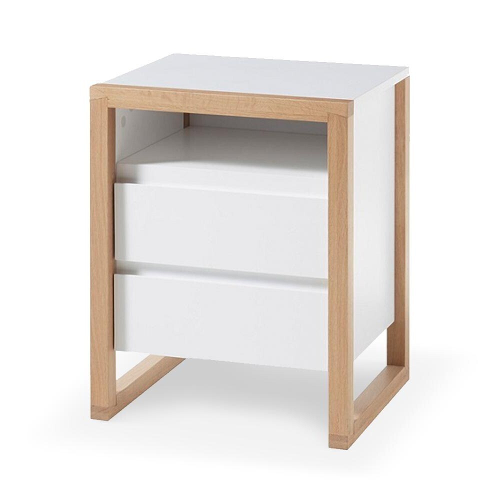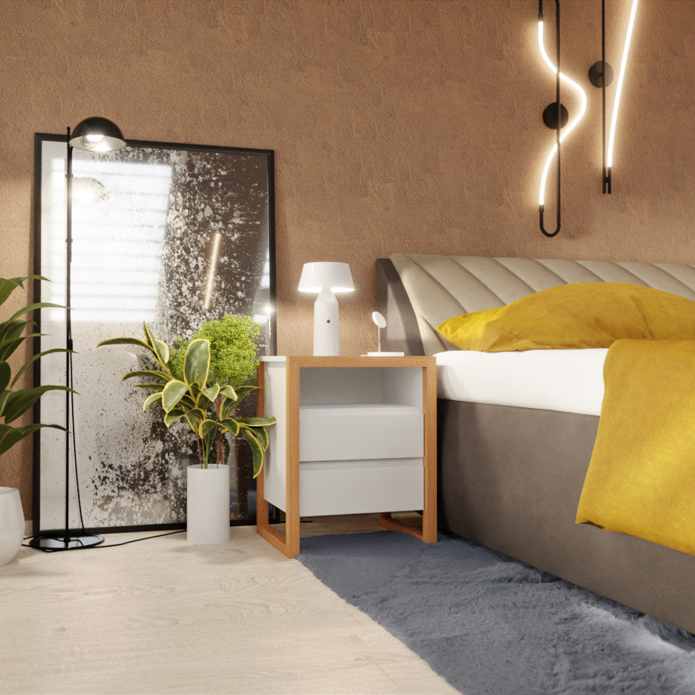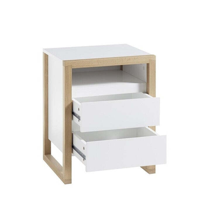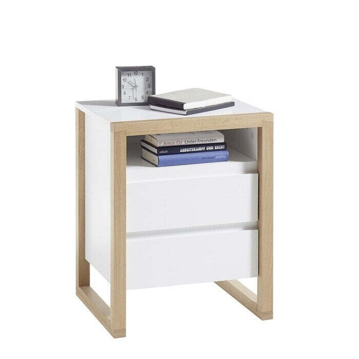 Nočný stolík ElonModerný nočný stolík Elon sa stane neoddeliteľnou súčasťou vašej spálne. Vďaka vyhotoveniu v kombinácii bieleho korpusu a rámu z masívneho duba nočný stolík zapadne do väčšiny interiérov. Dve zásuvky môžete využiť na uloženie najpotrebnejších vecí, ktoré chcete mať v spálni vždy k dispozícii. Na odloženie drobnejších predmetov môžete využiť aj policu alebo hornú dosku stolíka. Nočný stolík je vďaka svojej konštrukcii pevný a odolný, zároveň sa ľahko udržuje.