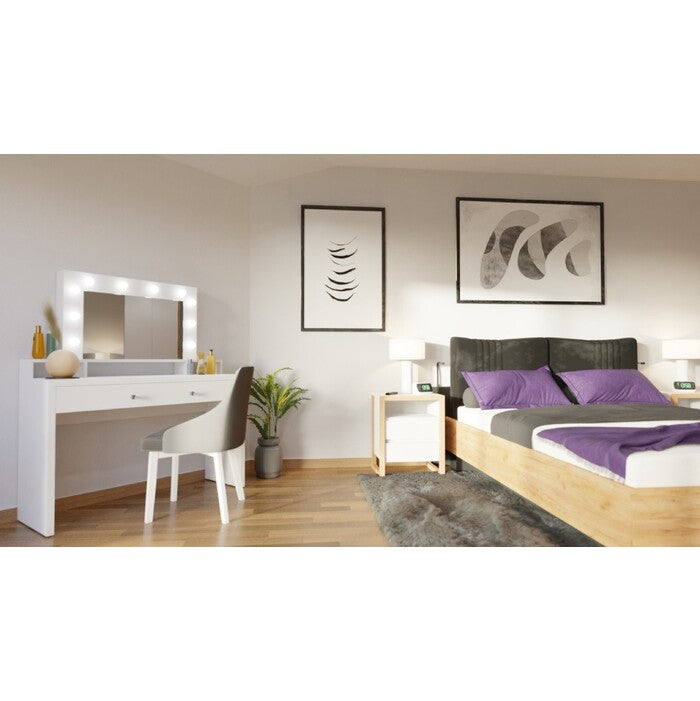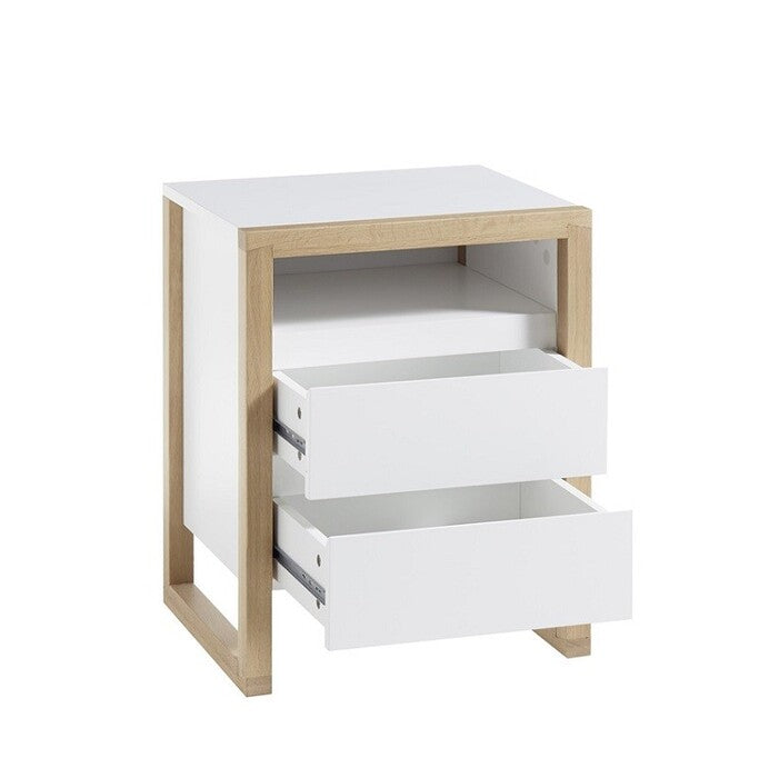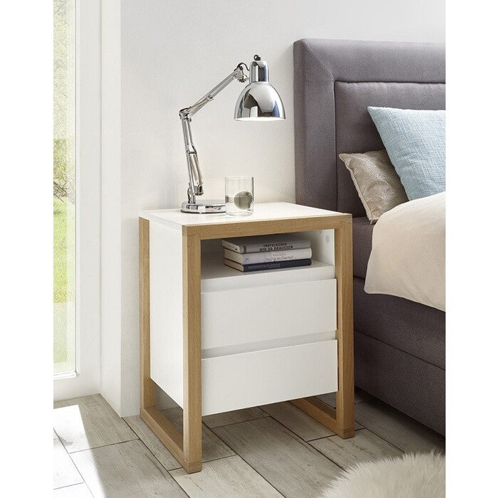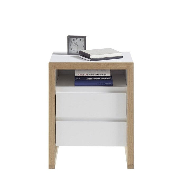 Nočný stolík ElonModerný nočný stolík Elon sa stane neoddeliteľnou súčasťou vašej spálne. Vďaka vyhotoveniu v kombinácii bieleho korpusu a rámu z masívneho duba nočný stolík zapadne do väčšiny interiérov. Dve zásuvky môžete využiť na uloženie najpotrebnejších vecí, ktoré chcete mať v spálni vždy k dispozícii. Na odloženie drobnejších predmetov môžete využiť aj policu alebo hornú dosku stolíka. Nočný stolík je vďaka svojej konštrukcii pevný a odolný, zároveň sa ľahko udržuje.