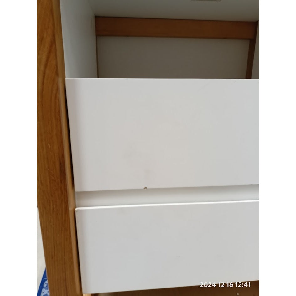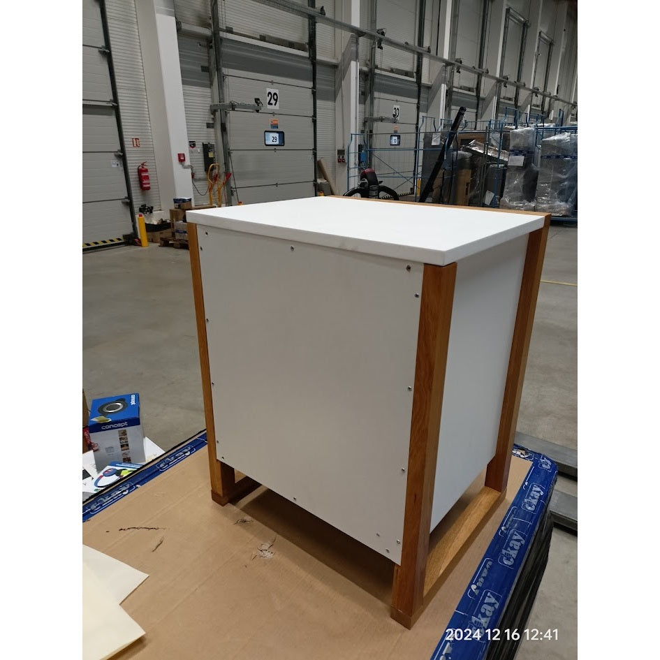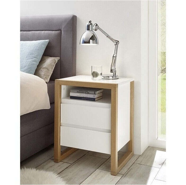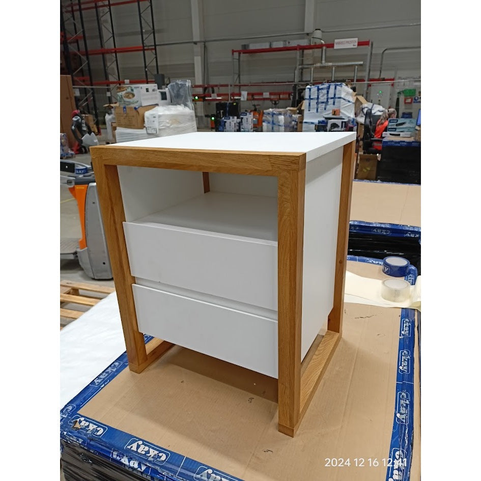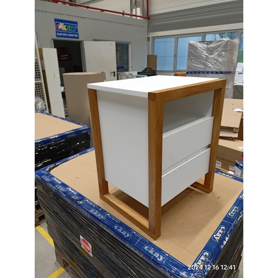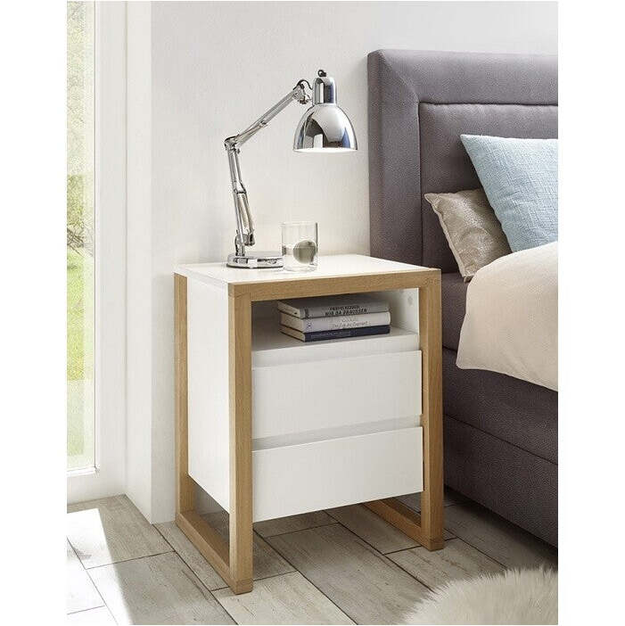 Nočný stolík ElonModerný nočný stolík Elon sa stane neoddeliteľnou súčasťou vašej spálne. Vďaka vyhotoveniu v kombinácii bieleho korpusu a rámu z masívneho duba nočný stolík zapadne do väčšiny interiérov. Dve zásuvky môžete využiť na uloženie najpotrebnejších vecí, ktoré chcete mať v spálni vždy k dispozícii. Na odloženie drobnejších predmetov môžete využiť aj policu alebo hornú dosku stolíka. Nočný stolík je vďaka svojej konštrukcii pevný a odolný, zároveň sa ľahko udržuje.