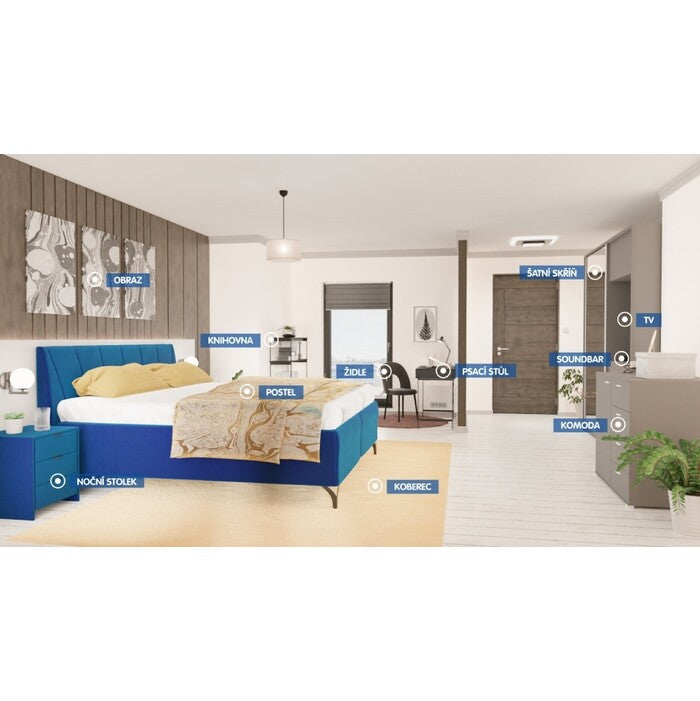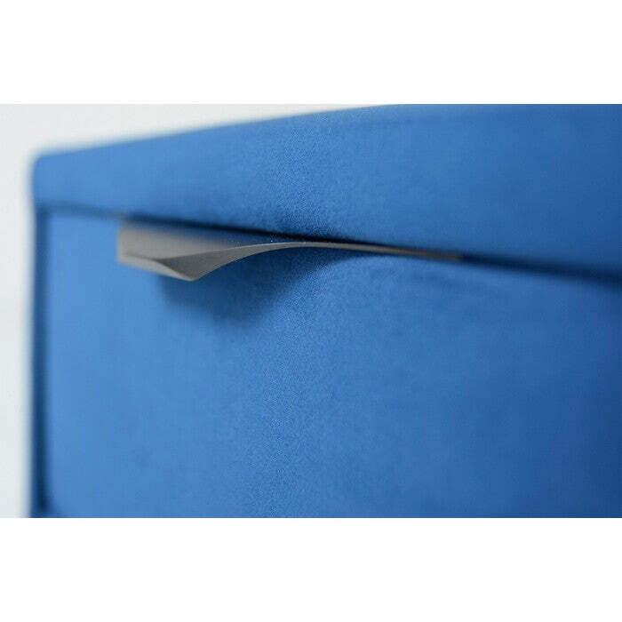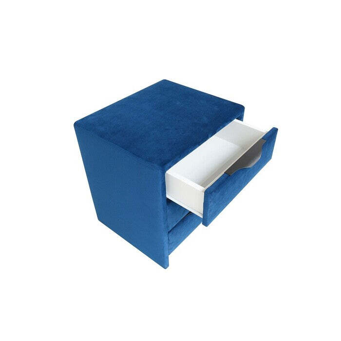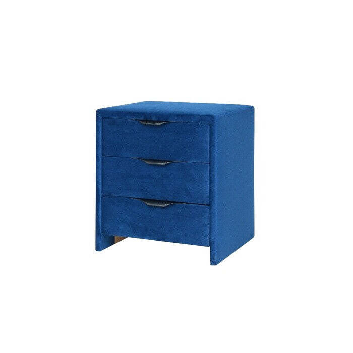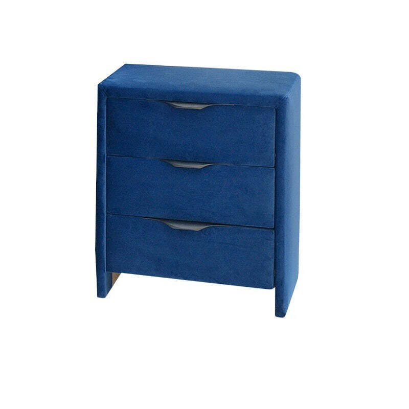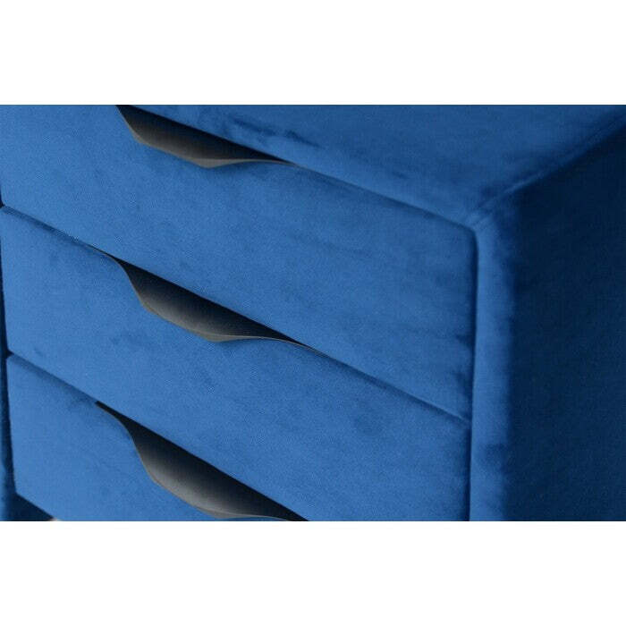 Nočný stolík FranzModerný nočný stolík Franz je vhodným doplnkom do spálne. Elegantný štýl stolíka sa stane výrazným prvkom vašej izby. Je potiahnutý kvalitnou modrou látkou pripomínajúcou zamat, ktorá je príjemná na dotyk. Tri zásuvky prehľadne členia vnútorný priestor, takže budete mať všetko prehľadne uložené. Nočný stolík je vďaka svojej konštrukcii pevný a odolný.