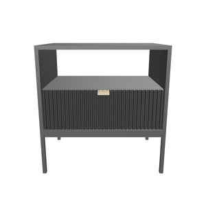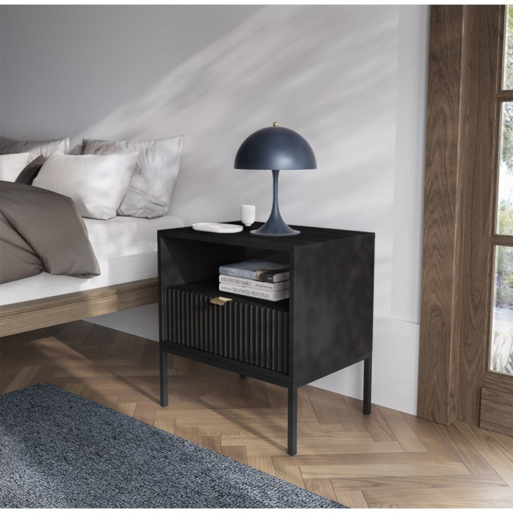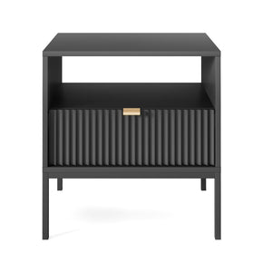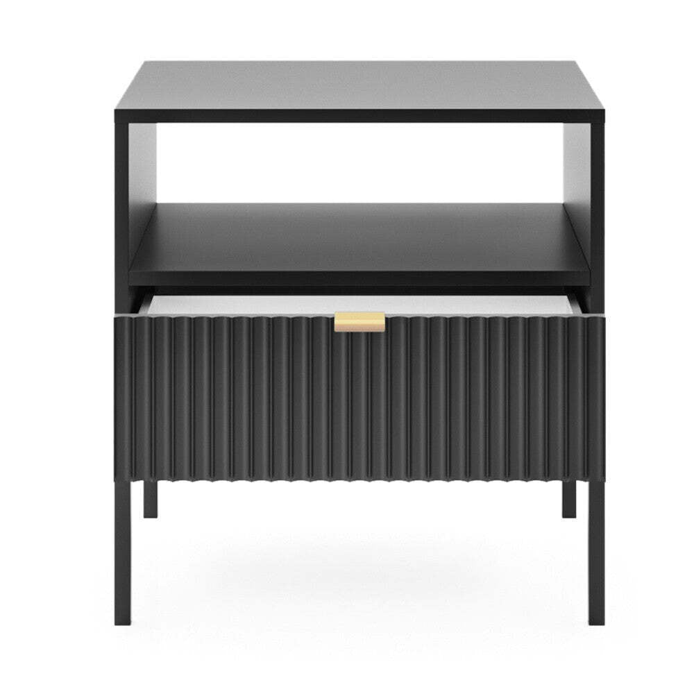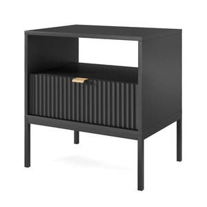 Moderný nočný stolík LoretPokiaľ si vybavujete vašu domácnosť a túžite po modernom a štýlovom nábytku, je štýlový nočný stolík Loret tou pravou voľbou. Ide o veľmi luxusný kus nábytku, ktorý skvele zapadne do každého interiéru. Kvalitné spracovanie dodáva stolíku dlhú životnosť a vysokú odolnosť. Stolík disponuje voľnou odkladacou doskou, na ktorú si môžete umiestniť rôzne dekorácie alebo lampu, ďalšia voľná plocha sa nachádza hneď pod doskou, kam sa pohodlne zmestia vaše rozčítané knihy alebo krabička s vreckovkami. Úložný priestor ponúka zásuvka, do ktorej si môžete uložiť všetko, čo chcete mať hneď po ruke. Zásuvka je doplnená o kovovú úchytku v zlatej farbe, ktorá spoločne s drážkovaným vzorom na prednej ploche vytvára zaujímavý prvok, o ktorý je stolík obohatený. Nočný stolík Loret je zhotovený z laminovaných drevotrieskových dosiek (LDTD) v kombinácii drevovláknitých dosiek (MDF) v klasickej čiernej farbe. Vysoké kovové nôžky dodávajú stolíku pevnú stabilitu a napomáhajú k ľahkému upratovaniu, ľahko pod neho zájdete vysávačom či mopom. K nočnému stolíku si môžete dokúpiť ďalší nábytok z rovnomenného programu a kompletne si tak vybaviť váš interiér. |